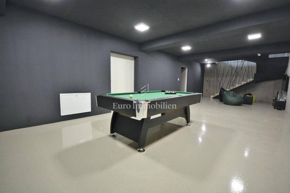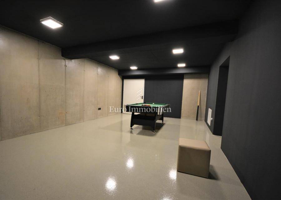 It consists of three floors - basement, ground floor, and first floor. In the basement, there is a playroom with TV, a wellness area consisting of a sauna, jacuzzi, and shower and boiler room for underfloor heating and cooling, storage, laundry room with a washing machine and dryer.