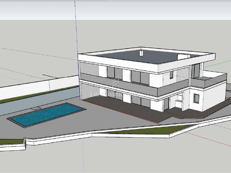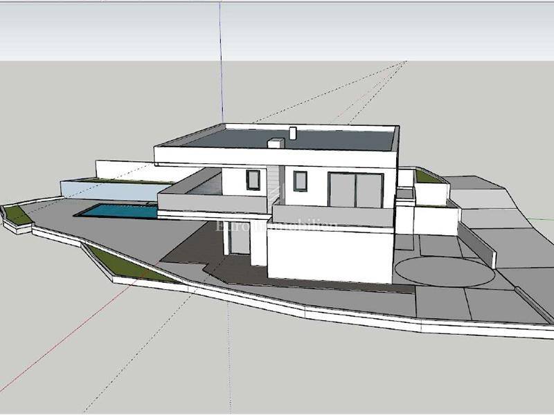 The permit enables the construction of a detached villa with a swimming pool, total gross area of 329 m2, distributed over three floors: basement, ground floor and first floor. The basement contains a multipurpose room of 54 m2, ideal for fitness, tavern or similar. On the ground floor there is a kitchen with a dining room, a living room, a bathroom, a laundry room, a laundry room, a spacious covered terrace and a garage. On the first floor there are three bedrooms, three bathrooms and two large covered terraces. The outdoor pool has an area of 48 m2. There are three parking spaces in front of the house. Construction can begin immediately, with a paved access road and available electricity and water connections on the adjacent lot. The land offers a fantastic view of the sea and the islands, and the villa is designed in a modern style, ideal for tourist purposes.