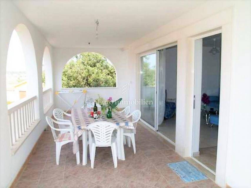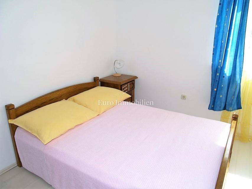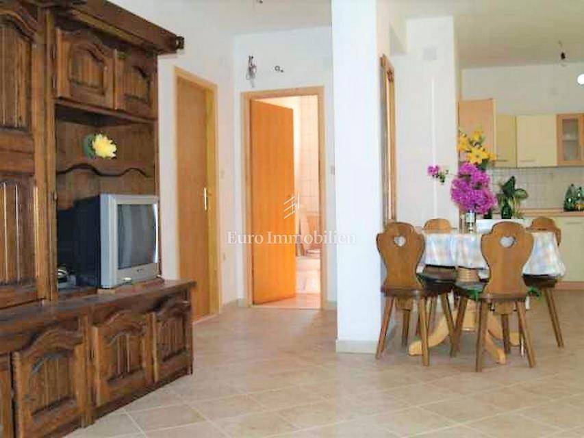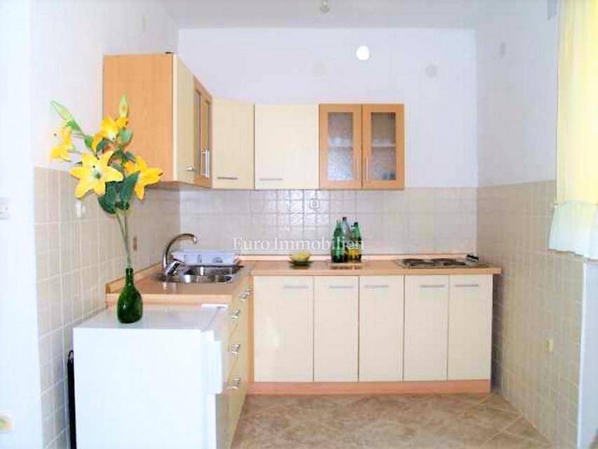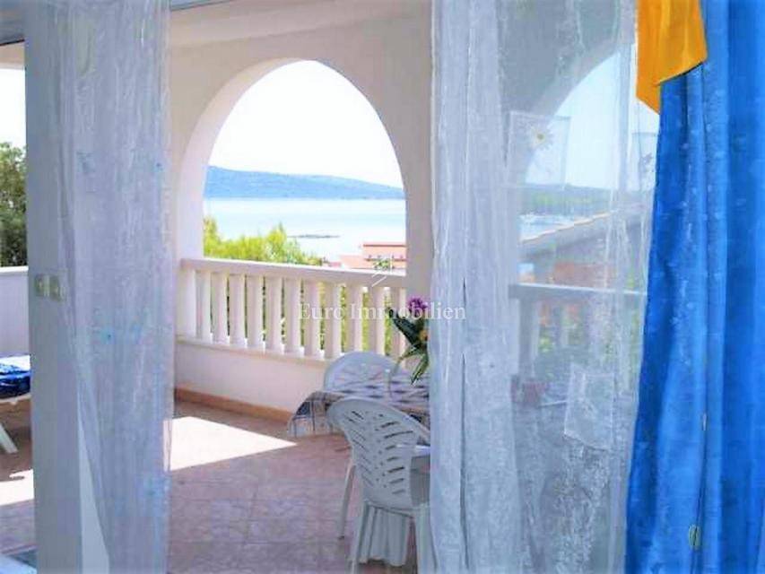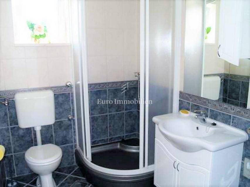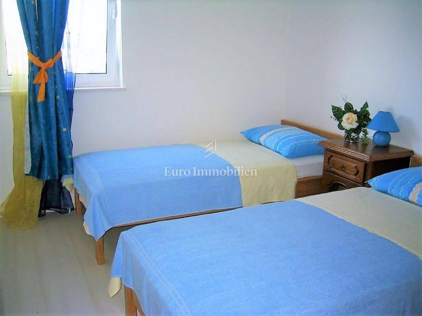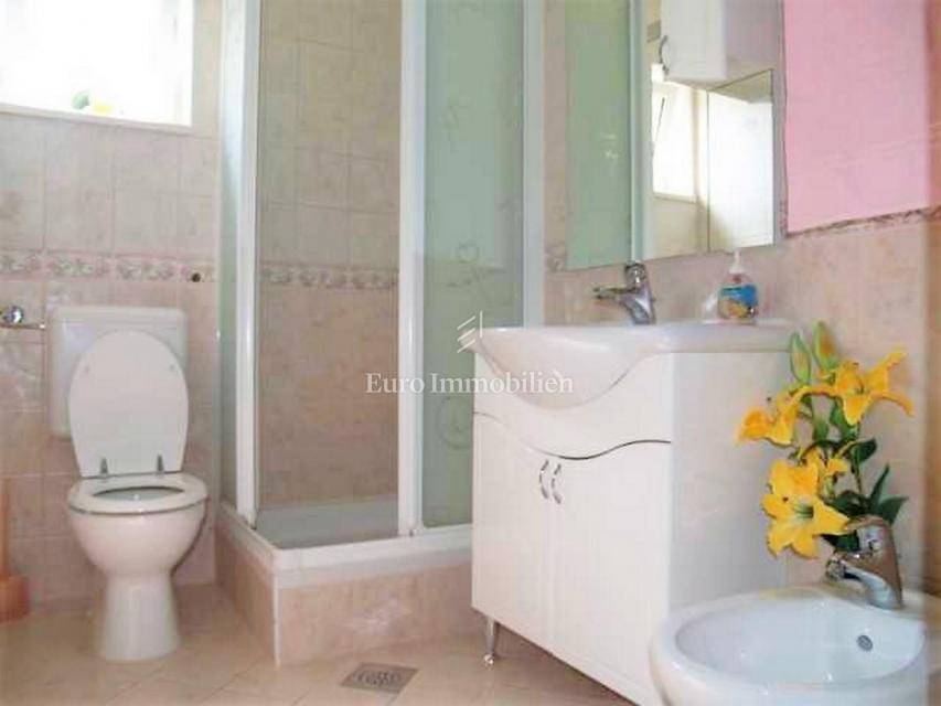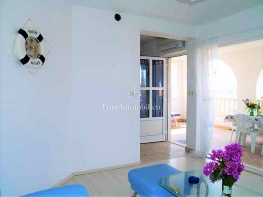 The house has a total of six apartments and a beautiful view of the sea from the spacious terraces, and it is about a 7-minute walk from the beach. The total area is 287 m2 spread over three floors or six apartments of different sizes. There is a private parking lot with seven parking spaces in the garden. There are two studio apartments and two one-room apartments on the ground floor of the house. On the first floor is a two-room apartment with access to a spacious terrace. On the second floor is a two-room apartment with a large terrace offering wonderful views. All accommodation units are furnished, equipped, and air-conditioned. Due to its excellent location, this house is ideal for tourist rental, but also as a house for summer family vacations.