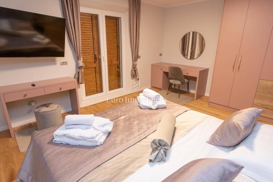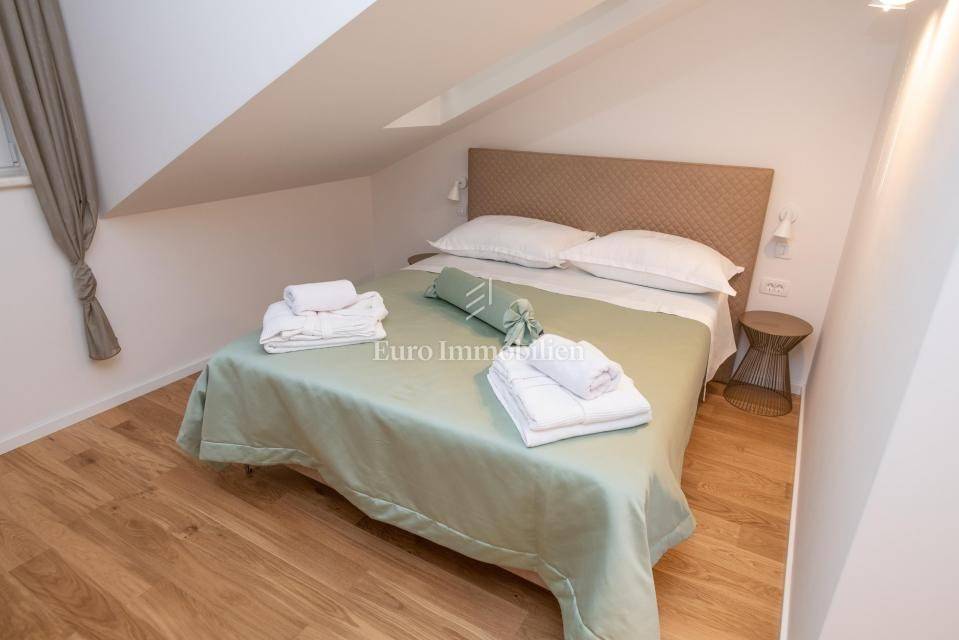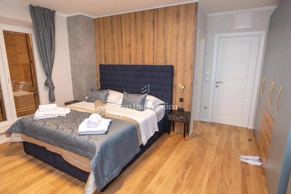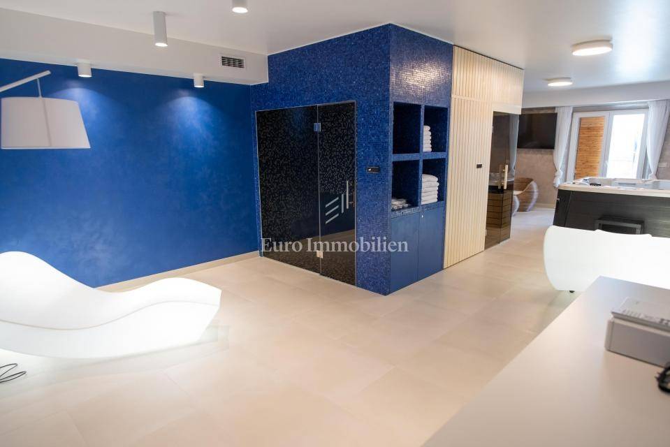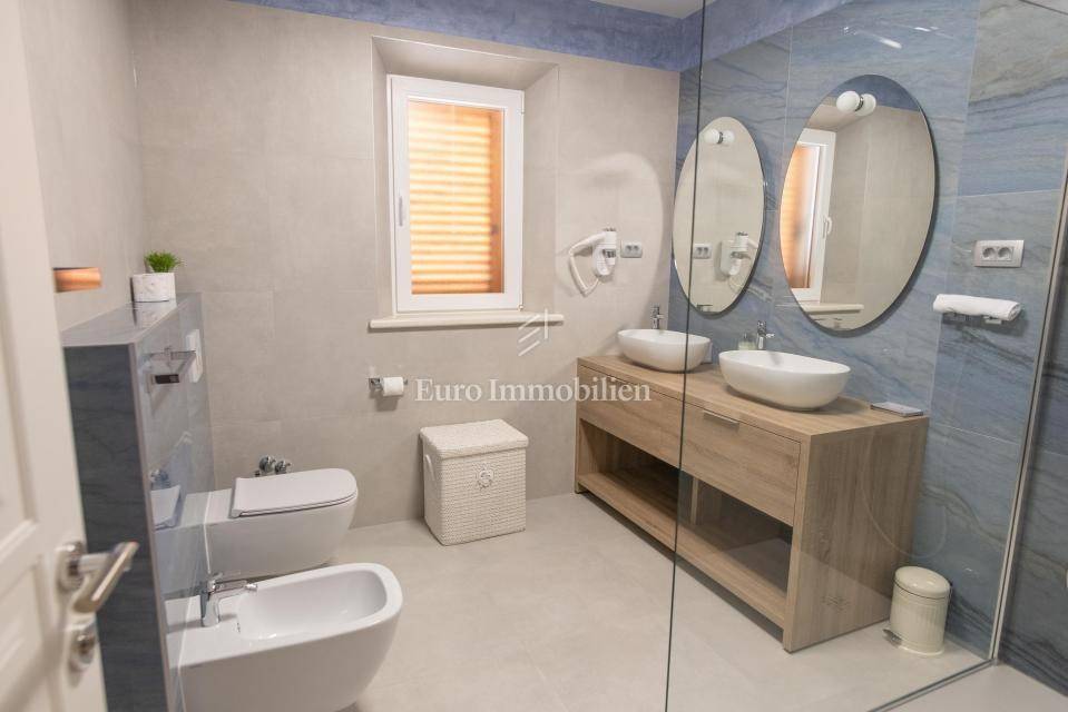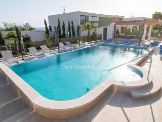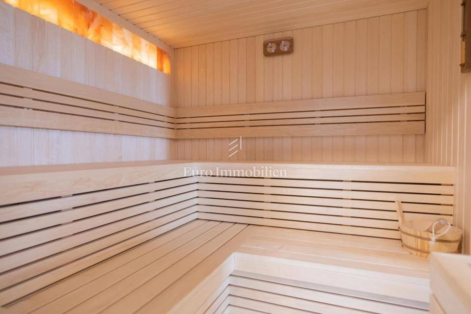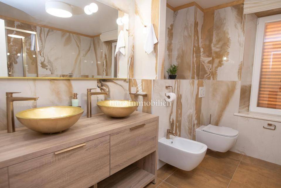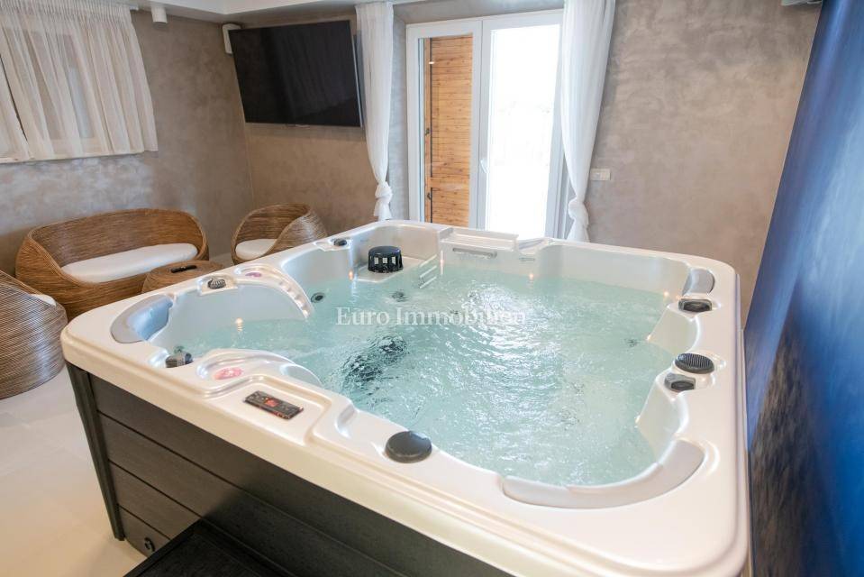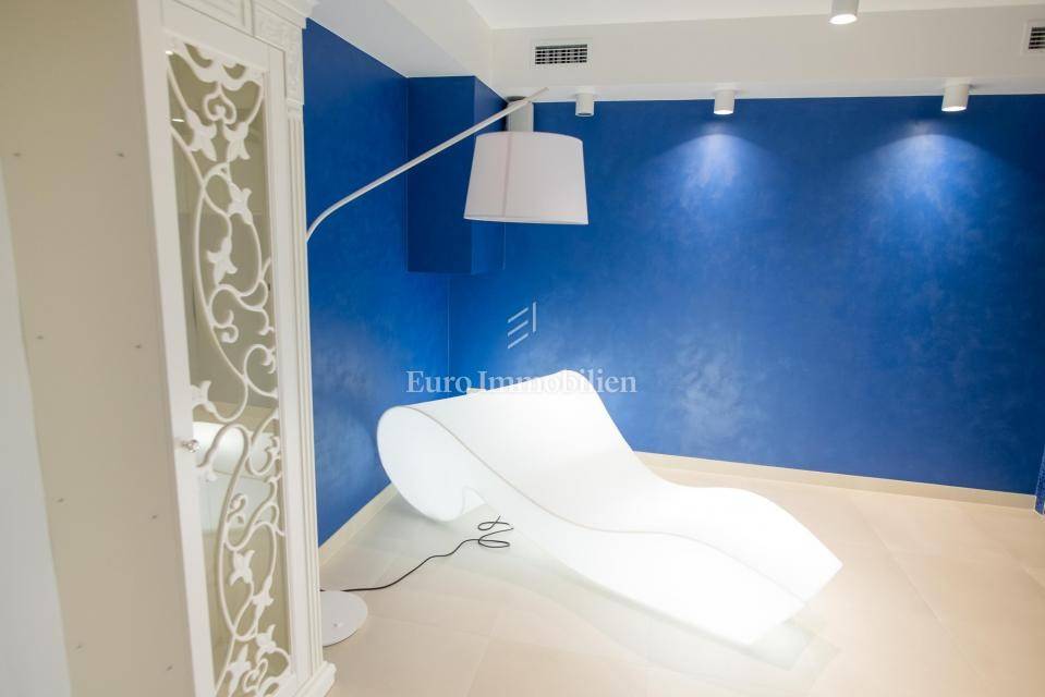 The villa has a luxurious Mediterranean design and is located in a top location. It consists of a basement, basement, ground floor, first floor, and attic/gallery. In the basement, there is a fitness room and an engine room. The basement consists of a room for hanging out with a fireplace, a sauna, and a spa area. From the basement, there is access to the garden, where there is a beautifully landscaped garden in Mediterranean style and a spacious swimming pool. The ground floor consists of a hallway, staircase, and three bedrooms - each room has its bathroom, balcony, entrance, and two terraces. Two bedrooms have access to the terrace. There is also a garage and laundry on the ground floor. On the first floor, there is a hallway, a living room with a kitchen and a dining room, one bedroom with a bathroom, a toilet and two terraces with a beautiful view of the sea. From the living room, a spiral staircase leads to the attic/gallery where there is another bedroom and bathroom. The house also has four parking spaces. It is located in a prime location, only 50 m from the sea. Opportunity!