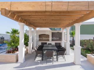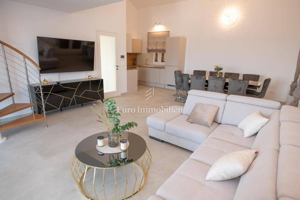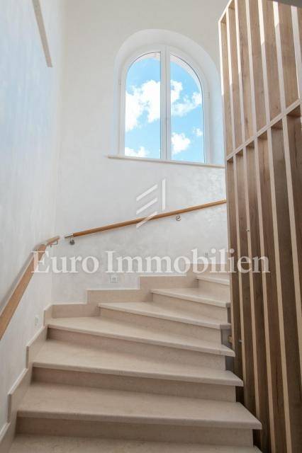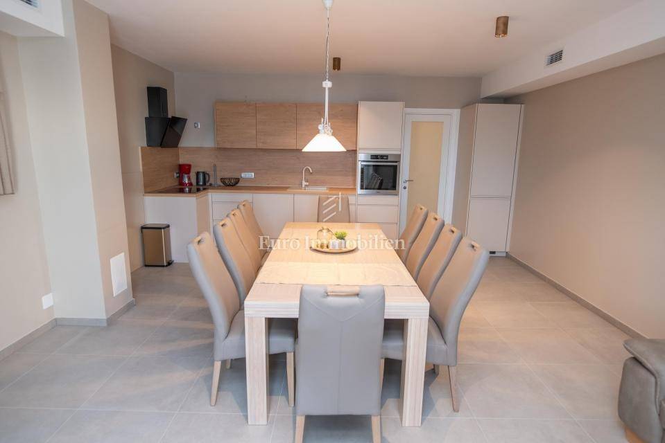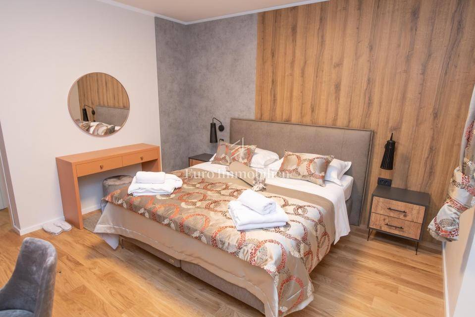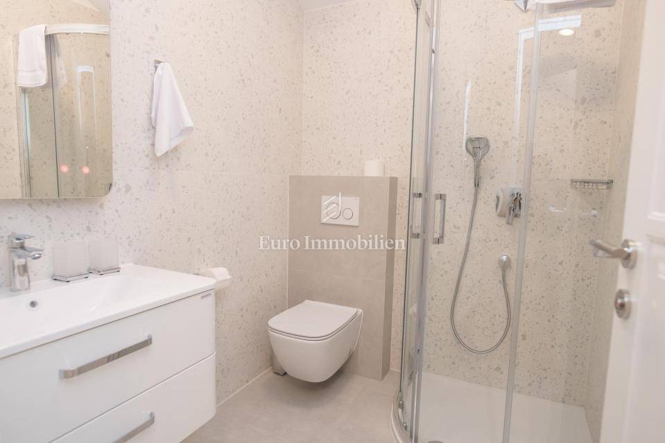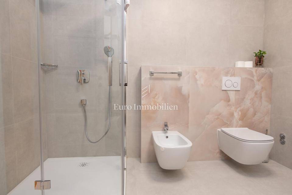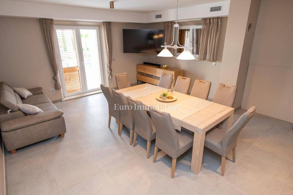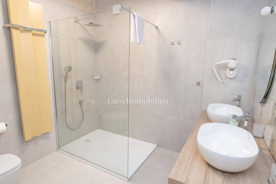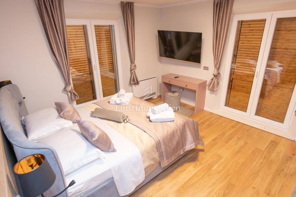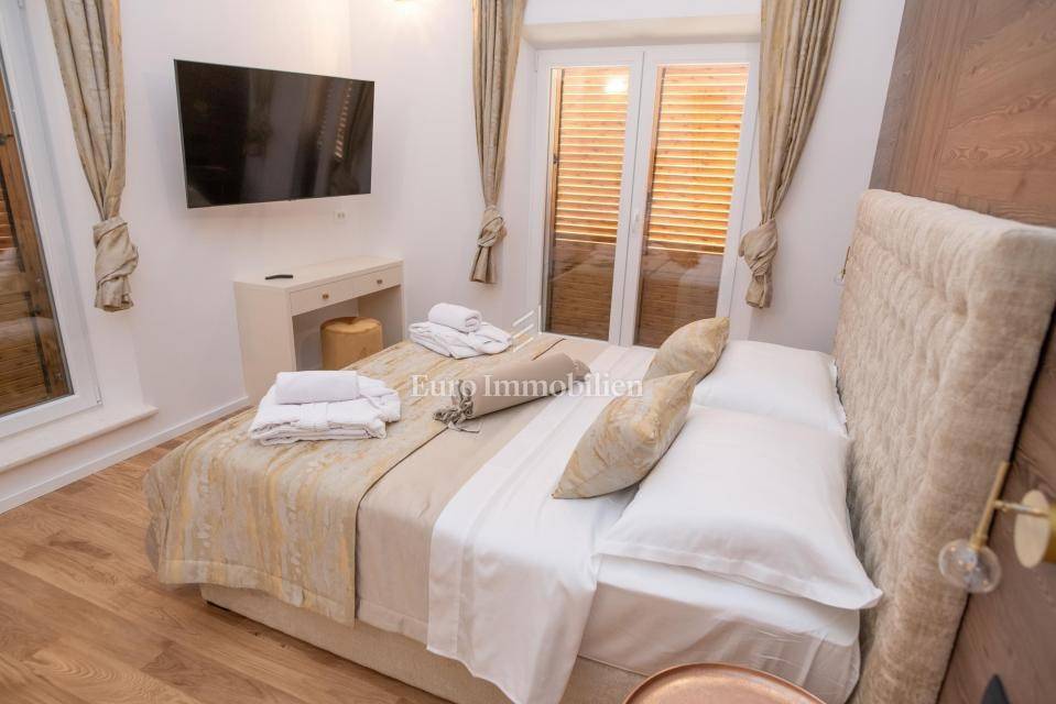 The villa has a luxurious Mediterranean design and is located in a top location. It consists of a basement, basement, ground floor, first floor, and attic/gallery. In the basement, there is a fitness room and an engine room. The basement consists of a room for hanging out with a fireplace, a sauna, and a spa area. From the basement, there is access to the garden, where there is a beautifully landscaped garden in Mediterranean style and a spacious swimming pool. The ground floor consists of a hallway, staircase, and three bedrooms - each room has its bathroom, balcony, entrance, and two terraces. Two bedrooms have access to the terrace. There is also a garage and laundry on the ground floor. On the first floor, there is a hallway, a living room with a kitchen and a dining room, one bedroom with a bathroom, a toilet and two terraces with a beautiful view of the sea. From the living room, a spiral staircase leads to the attic/gallery where there is another bedroom and bathroom. The house also has four parking spaces. It is located in a prime location, only 50 m from the sea. Opportunity!