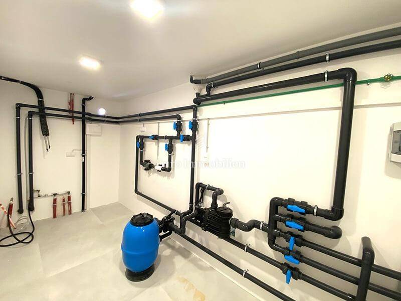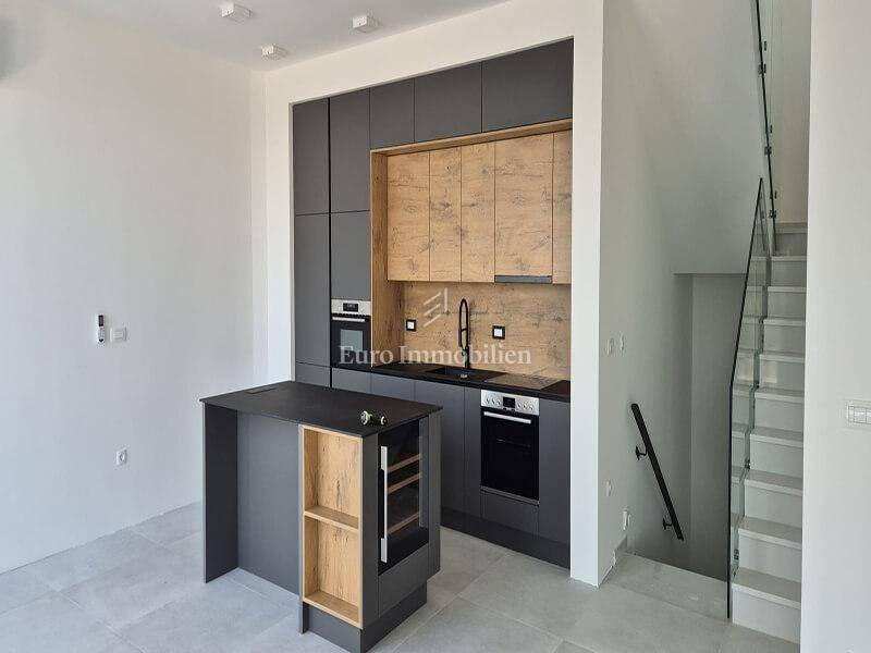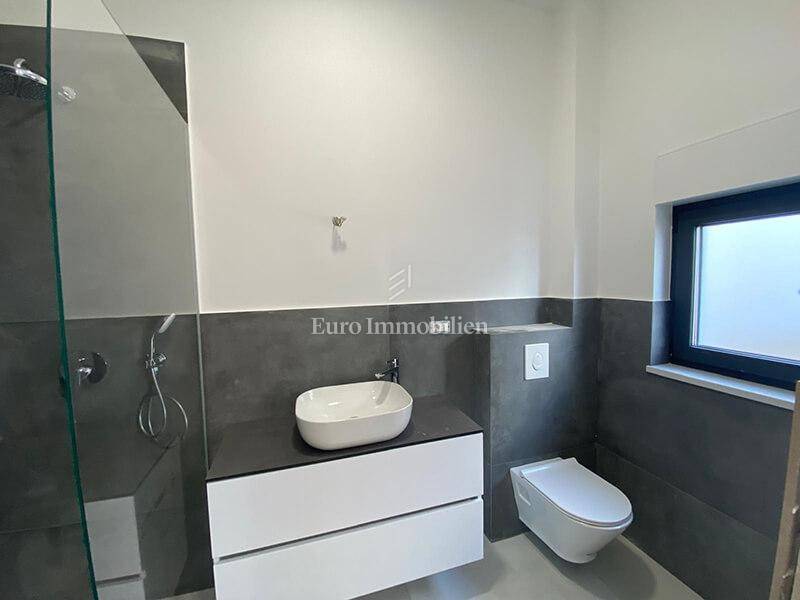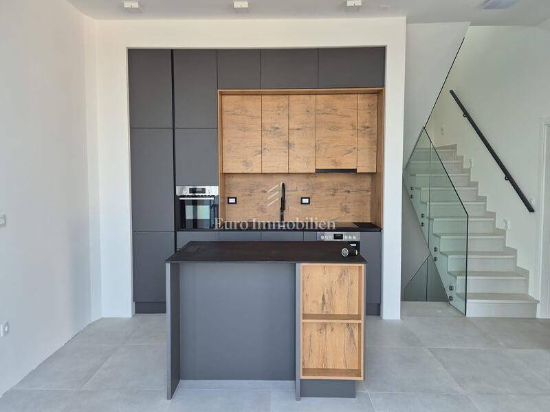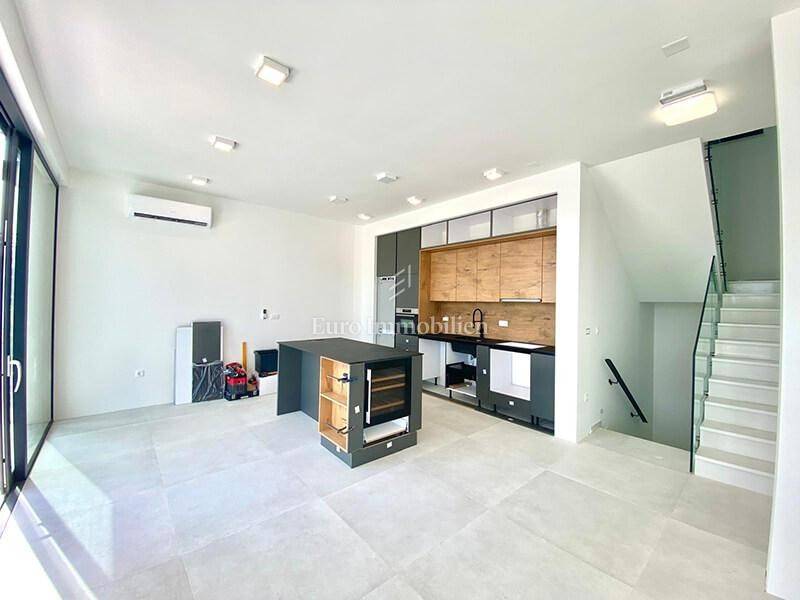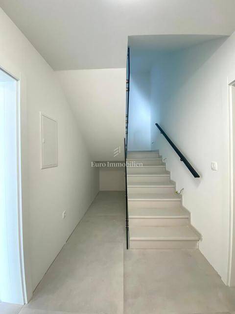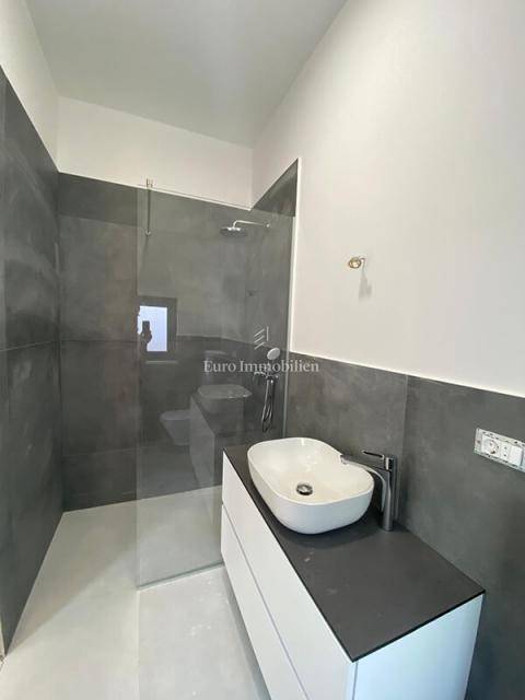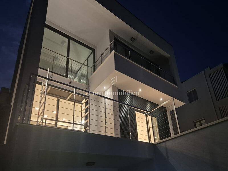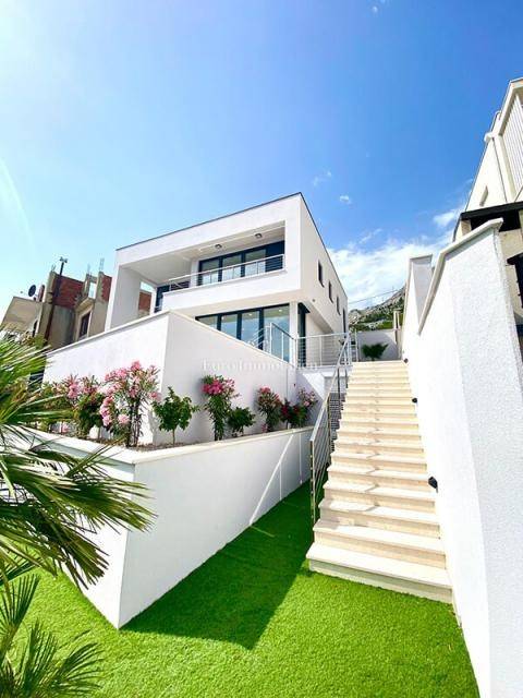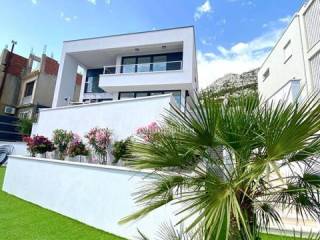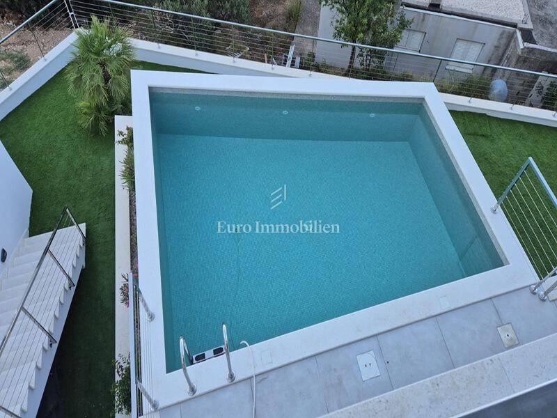 The area of the villa is 276 m2, and it is divided into the basement, ground floor, and first floor, and the land area is 379 m2. The basement consists of a summer kitchen, a terrace, a bathroom, a boiler room, and a fitness room. On the ground floor, there is a kitchen and dining room, a living room, a bathroom, and a bedroom, as well as a spacious outdoor terrace with a pool and a garden. On the first floor, there are three more bedrooms with three bathrooms and a large balcony. The house also has outdoor parking for three cars. The villa is oriented to the south, and from every corner of the house, there is a fantastic panoramic view of the sea and the islands, which cannot be enclosed. The highest quality materials are used in the construction and interior decoration of the villa. There is a possibility to choose materials for interior decoration according to the wishes of the customer. Superior heat and sound insulation, air conditioning, external PVC joinery, solar panels for hot water, glass fences on the balconies, high-quality ceramics, and fully equipped bathrooms with underfloor heating are just some of the equipment.