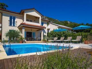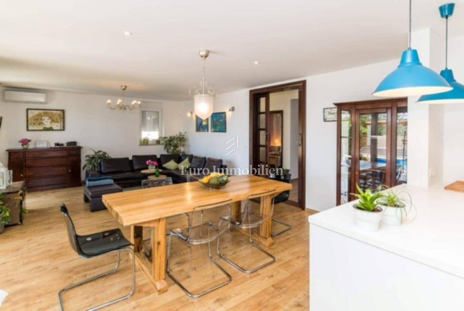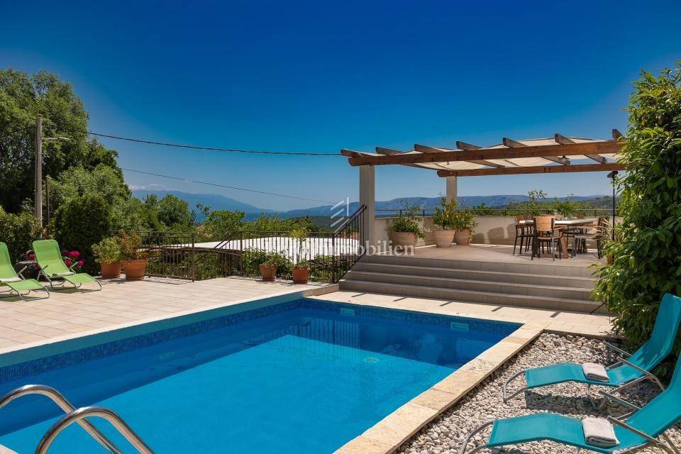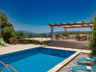 There is a large garage and parking for several cars next to the driveway. On the elevated part of the garden, there is a house, which consists of a ground floor and an upper floor. The ground floor is an open space living room, kitchen, and dining room, and on the ground floor, there is also a bedroom, a bathroom, and a separate toilet. An internal staircase leads to the first floor where there are three bedrooms and two bathrooms. There is a large swimming pool with a sunbathing area and a lookout point in the garden. The property is fully decorated and furnished. Opportunity!