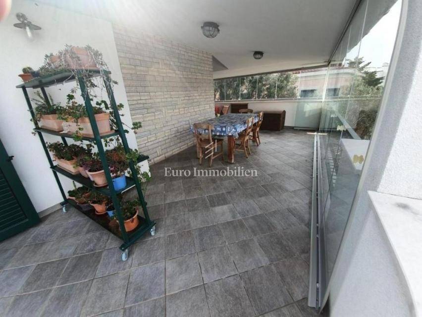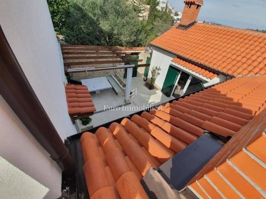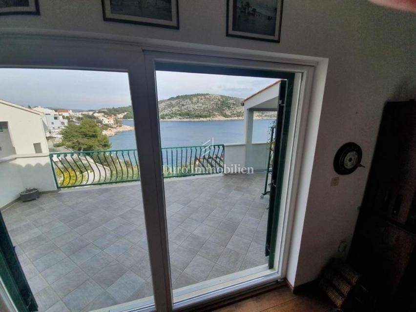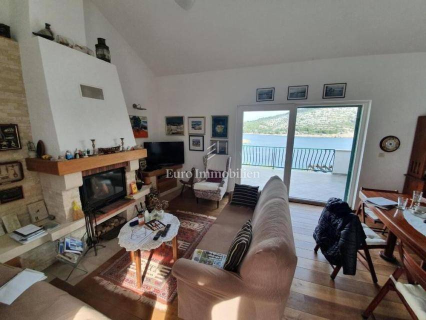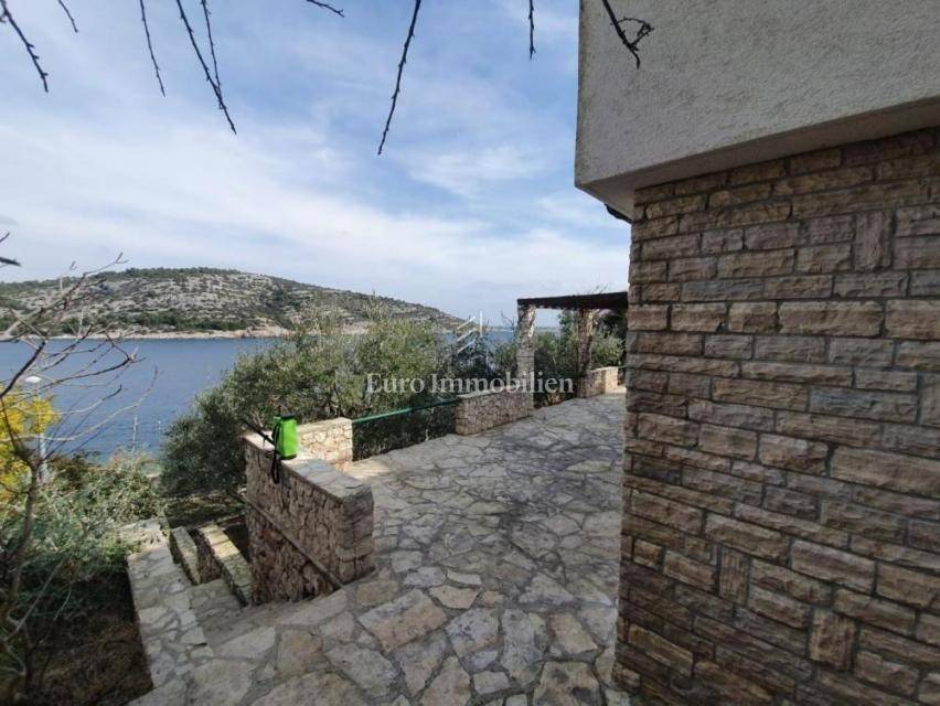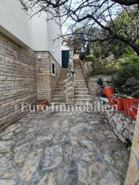 The house is divided into two floors and has a landscaped garden, and it also has a mooring for a boat. The total area of the property is 292 m2, and it was built on a plot of 900 m2. On the ground floor, there are two studio apartments, and on the first floor, there is one large apartment, a storage room, and a tavern with a toilet. The large apartment consists of a living room, dining room, and kitchen, two bedrooms, and a bathroom. The living room leads to a spacious and partially covered terrace of 44 m2 with a beautiful open view of the sea. The carefully arranged garden contains a garden with olives and other Mediterranean plants, a garden house, and a summer kitchen with a space for socializing. The property also includes a garage, three additional parking spaces, and a boat mooring.