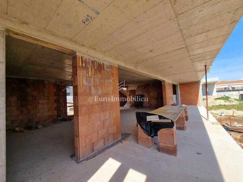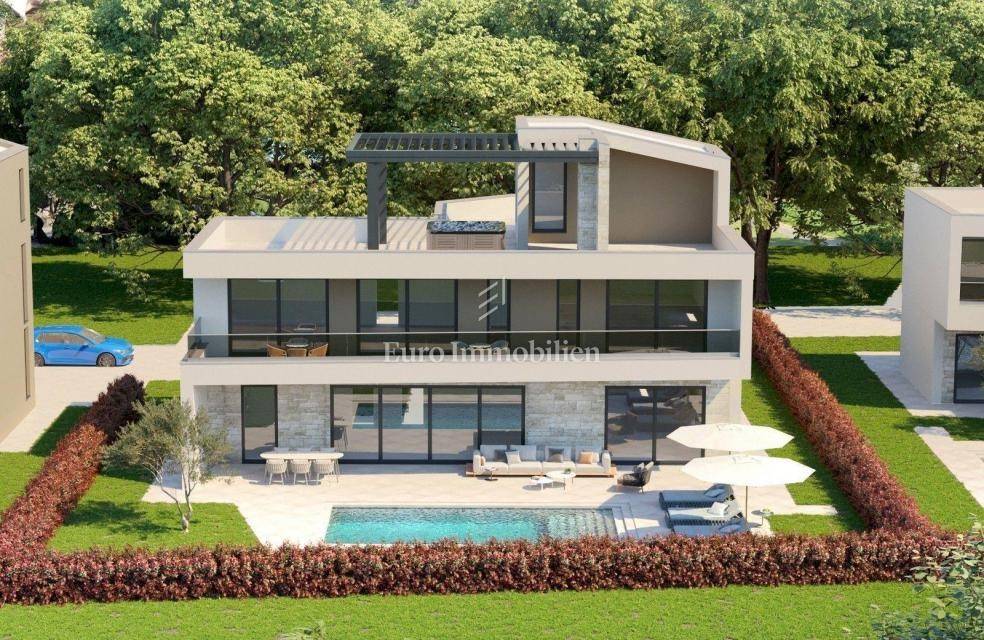 The planned completion is by the end of 2023 at the latest, but if an interested buyer is found, it is possible even earlier. The house is sold without furniture and equipment. It consists of the ground floor and the first and second floors. On the ground floor there is a laundry room, a toilet, a wellness area, a corridor, a storage room and a large living room of 57.50 m2, from which there is access to a covered terrace and garden. A 32 m2 swimming pool is planned in the garden. Internal stairs lead to the first floor where there are four bedrooms and four bathrooms with terraces. Each room has a bathroom and a terrace, three of which look directly at the sea. On the second floor there is an open and covered terrace for enjoying the panoramic view of the sea and nature. The heating will be underfloor heating via a heat pump and there will be air conditioners in each bedroom. The carpentry will be aluminum, and the sliding walls will have three-layer glass and electric blinds. The advantage of buying a building under construction is that you can agree with the investor on the selection of ceramics, sanitary ware and landscaping according to your own taste. Behind the project stands a renowned company with numerous references.