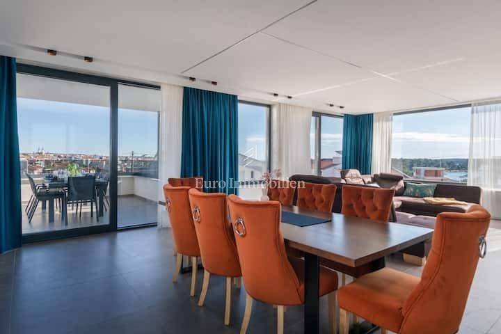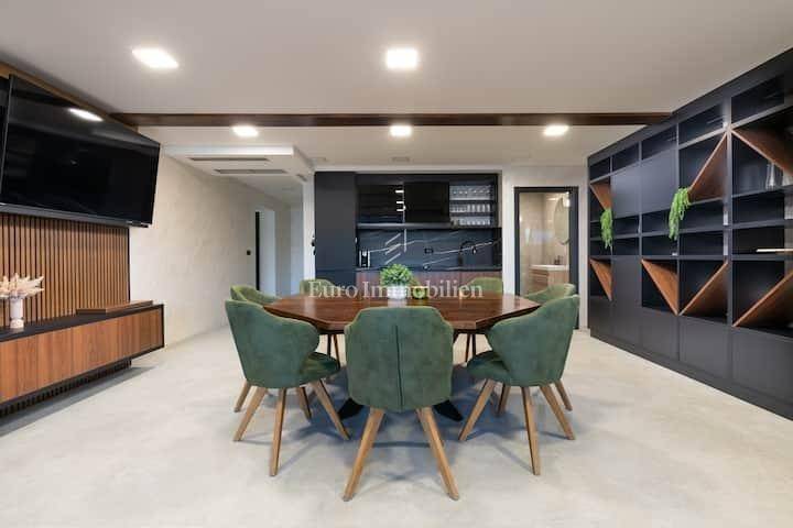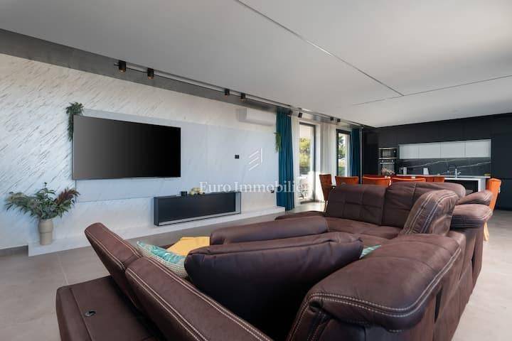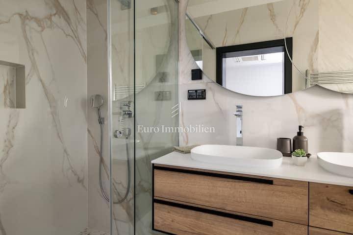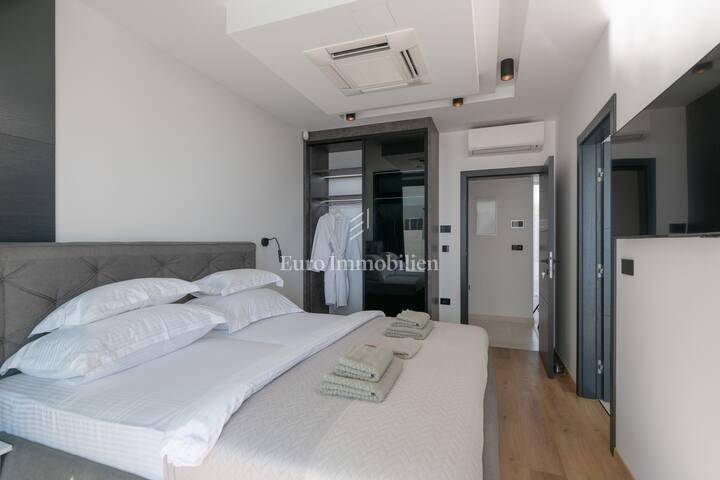 On the top is another bedroom with a bathroom and a large wellness area and a roof terrace with a beautiful view of the sea.