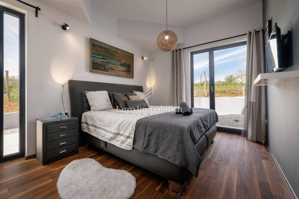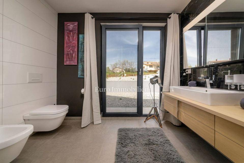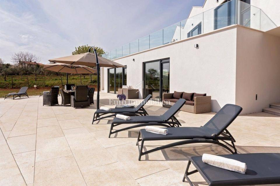 This unique villa in its appearance and architecture is located in the wider vicinity of Poreč (distance approx. 18 km), on the edge of a small Istrian village (conveniences such as discount shops, schools, churches, restaurants are 4 km away). It was built at the end of 2020. It is located on a large plot of 6270 m2 with a view of nature and vineyards. It has a total usable living area of ​​454 m2, 6 parking spaces, a 36 m2 swimming pool, and a spacious garden that can be used for additional facilities or an olive grove. The house itself consists of a ground floor and an upper floor. On the ground floor there is a large open space where there is a living area - living room, dining room, top-quality kitchen, then two bedrooms with bathrooms, a storage room, a boiler room and a garage. From all rooms on the ground floor you can exit to the garden to the summer terrace and swimming pool. On the upper floor there are four more bedrooms, each with its own bathroom, and a spacious terrace that is connected to the garden. The equipment of the house is at a high level, every piece of furniture, materials and equipment was chosen with full attention of the owner. The house is sold fully furnished as in the photos. The heating is underfloor, and air conditioning units have also been installed. It is an ideal choice for those looking for quiet and authentic locations with more accommodation capacity.