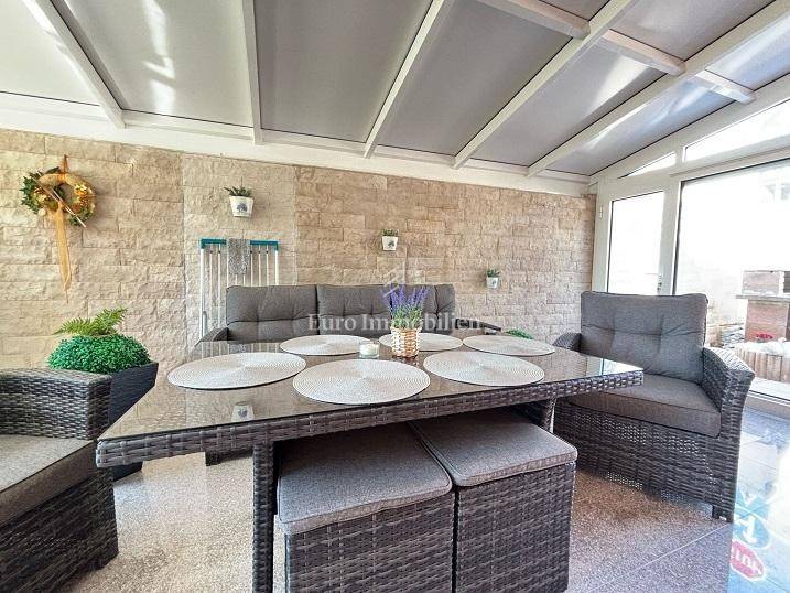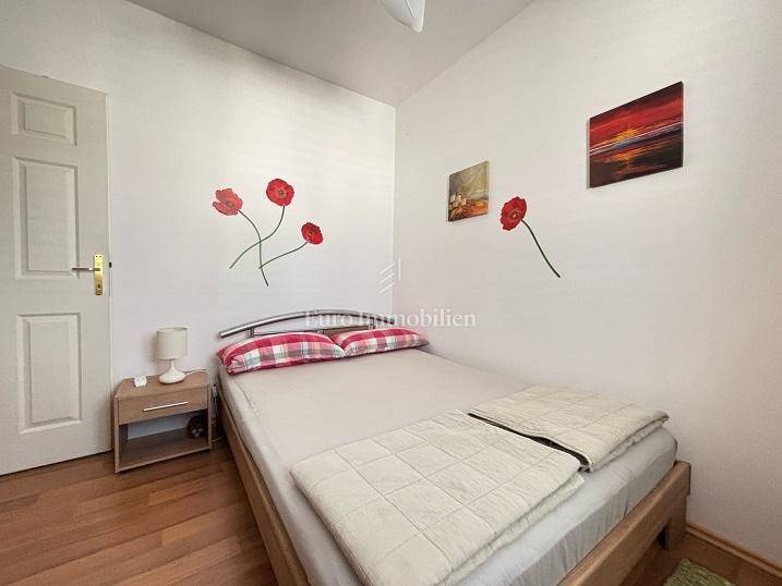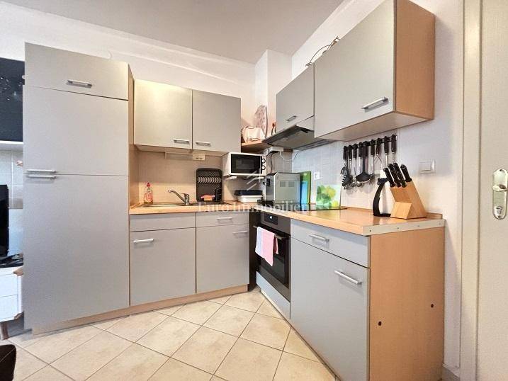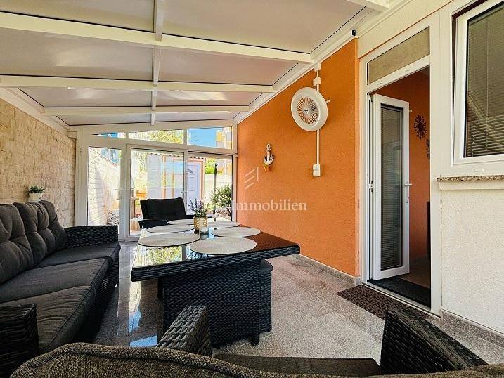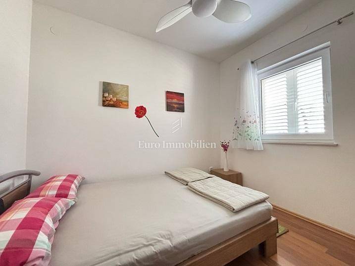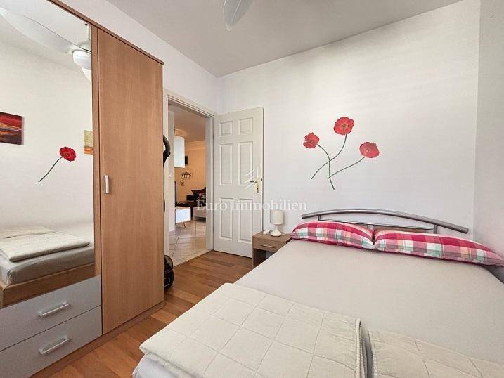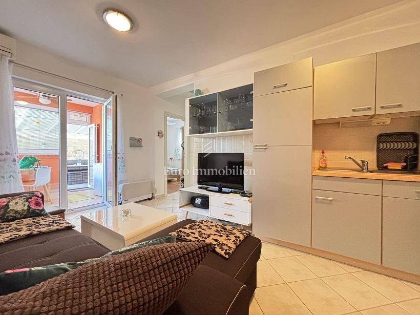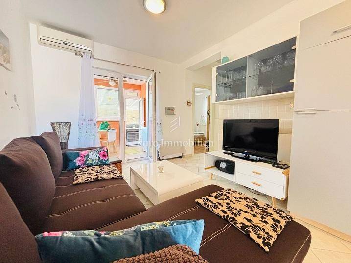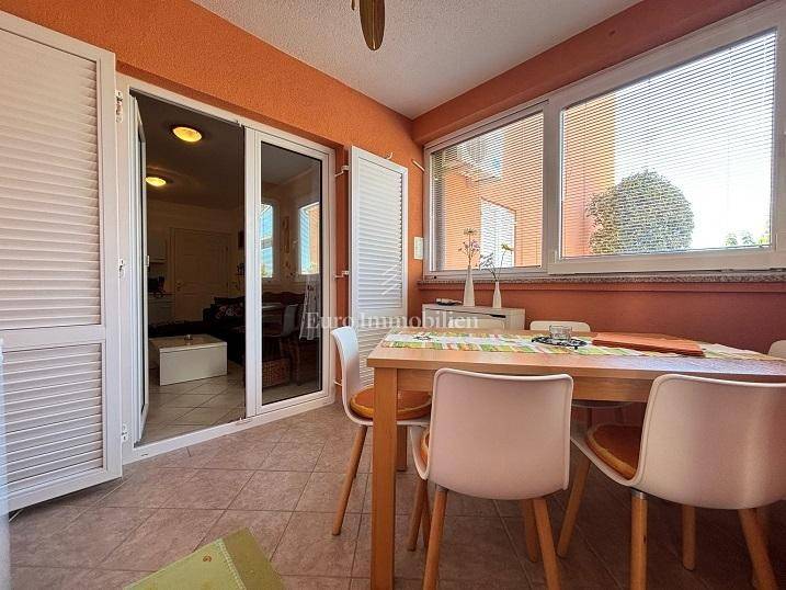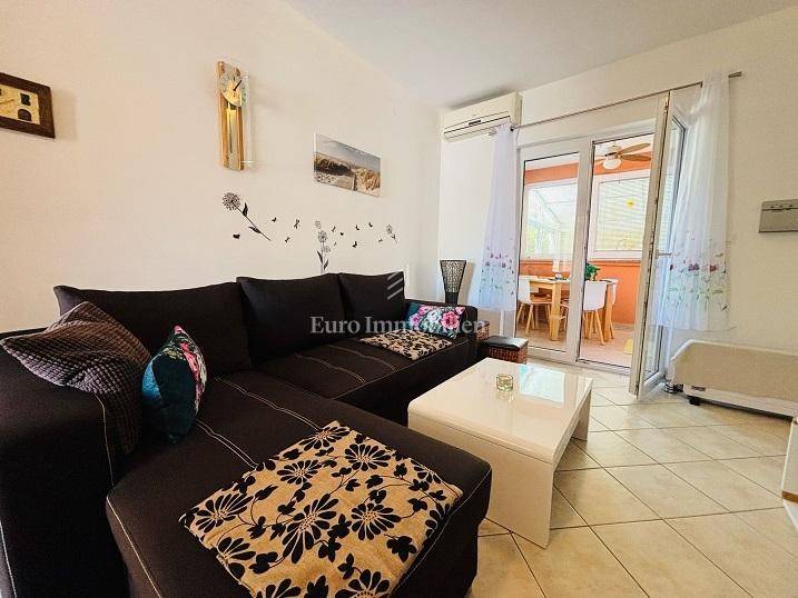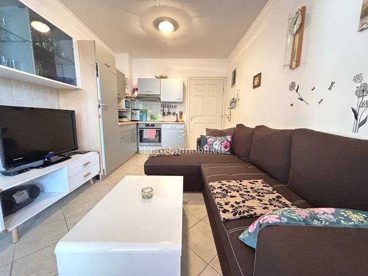 It consists of a living room with kitchen and dining area, 2 bedrooms, bathroom with toilet, total area 42.30 m2. In front of the apartment is a large, covered terrace and a garden of 88 m2, as well as a parking space.