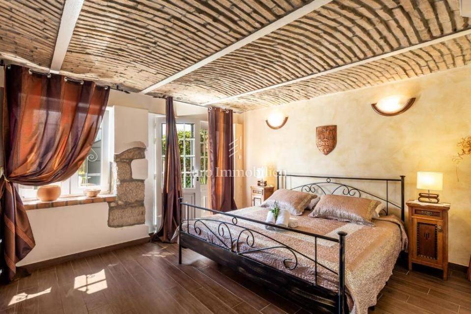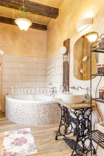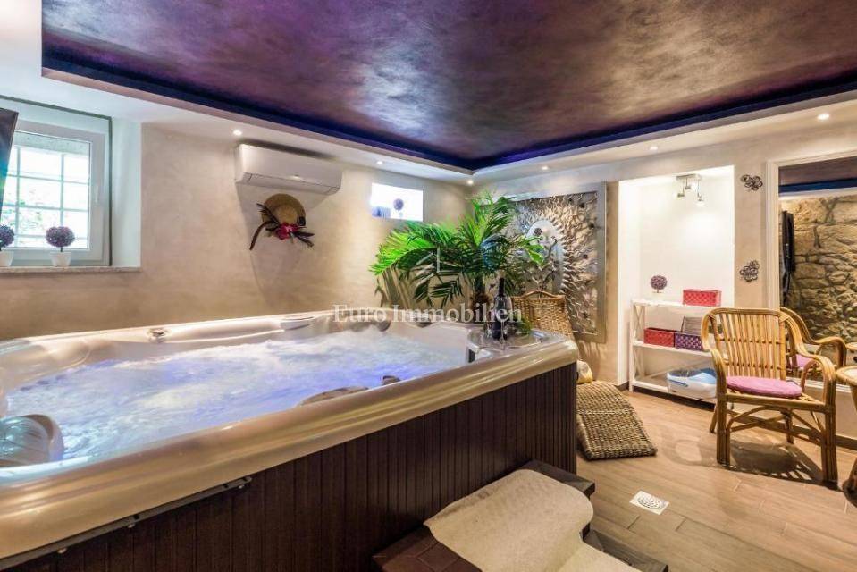On the ground floor there is a bedroom with a bathroom and a wellness area. On the first floor there is a kitchen with a dining room, a living room, a bedroom with a bathroom and an exit to the yard where there is a swimming pool. In the high attic there are two bedrooms, each with its own bathroom. There is a view of the lake from the terraces.