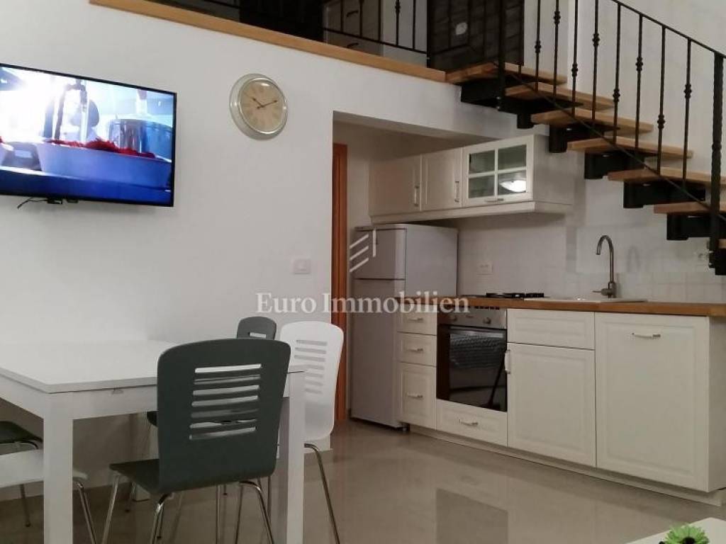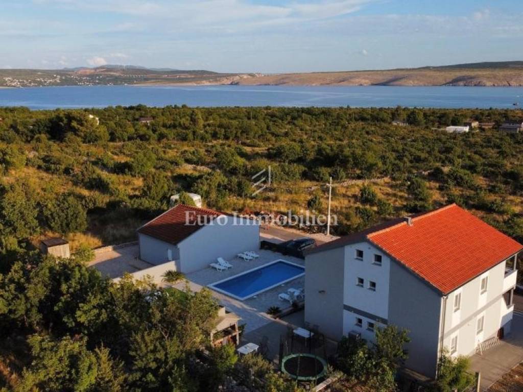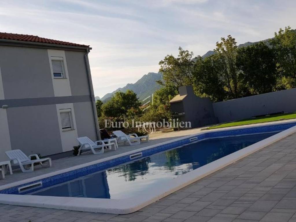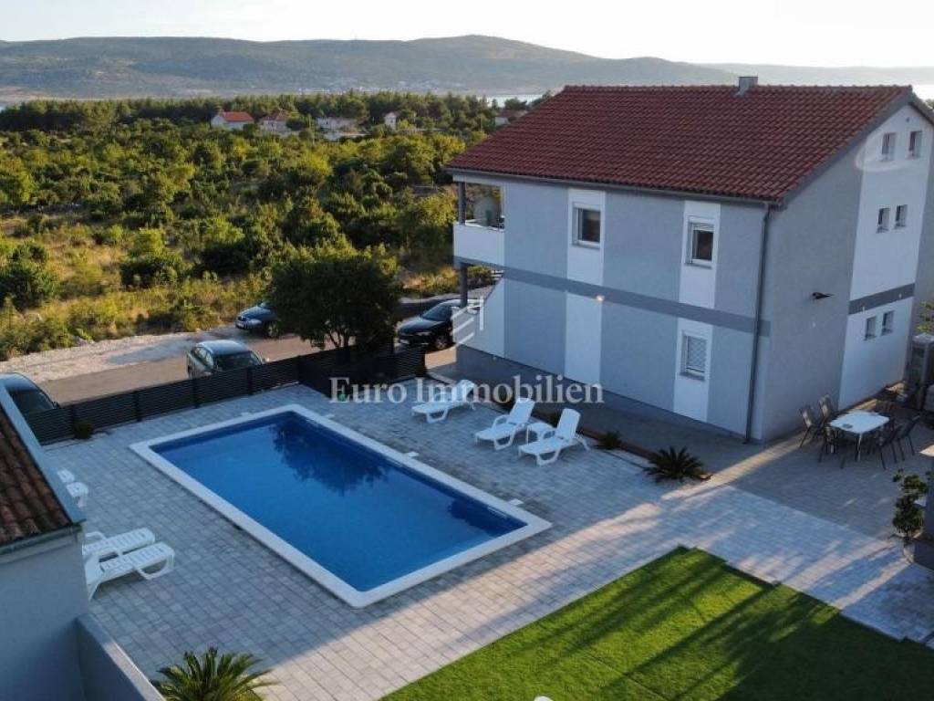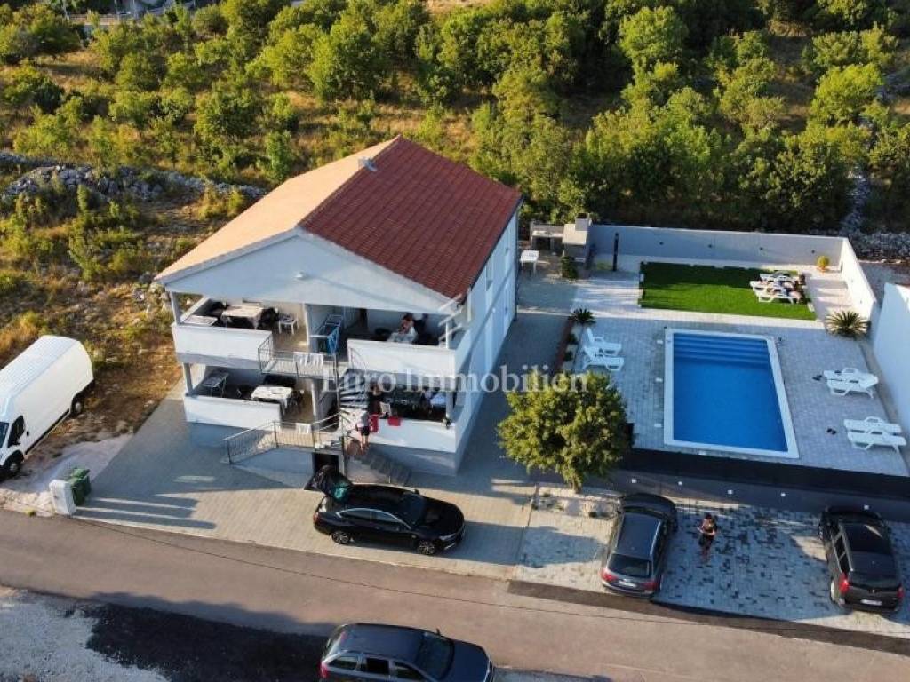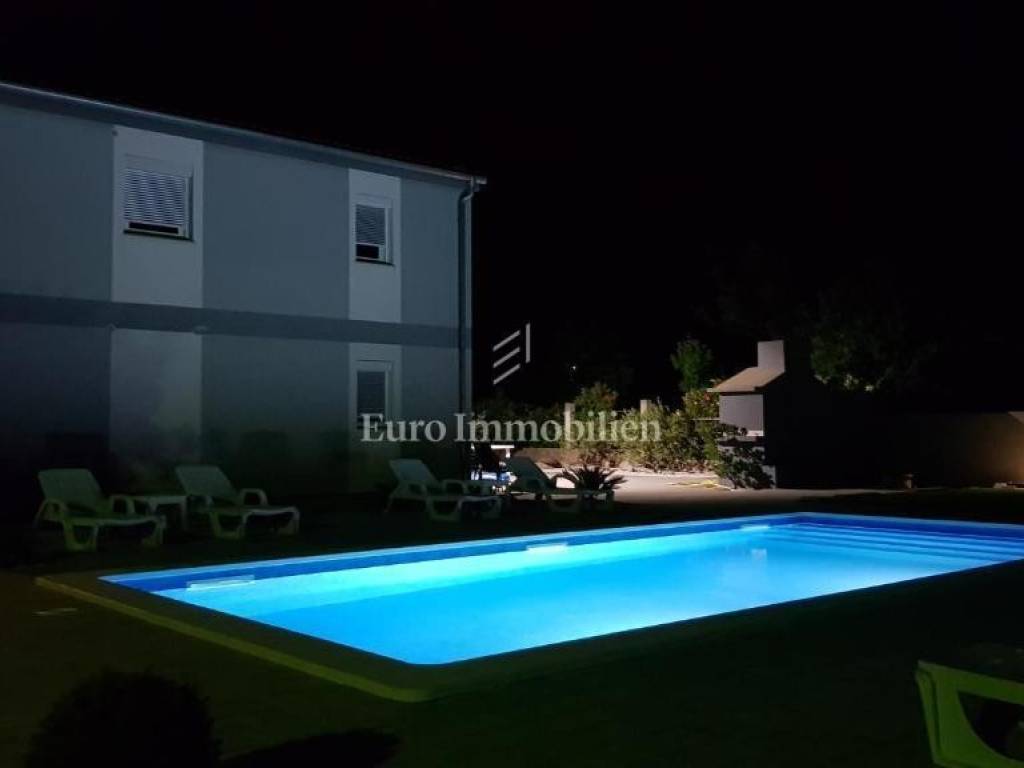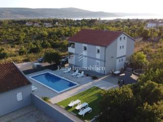 The house of 180 m2 has four furnished apartments. The apartments have an area of 40 m2 on the ground floor, and 40 m2 on the first floor + 10 m2 galleries where the beds are located. Each apartment has a separate entrance via a 10 m2 terrace. All apartments are furnished with modern furniture and fully equipped (air conditioner, TV, dishwasher, washing machine, oven). There are 6 parking spaces in front. The yard is spacious and has a large outdoor fireplace, a garden and a swimming pool. The swimming pool measures 9x4 meters, covered with a glass-ceramic mosaic and a large sunbathing area with a total area of 200 m2. The house was completed in 2015, and quality materials were used in its construction. The swimming pool and sunbathing area was built in 2021