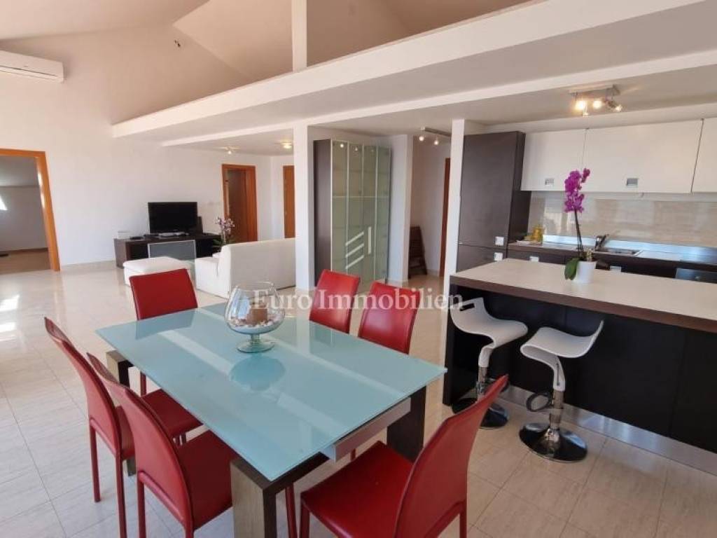 The apartment of 144.42 m2 consists of two bedrooms (one with a large utility closet), two bathrooms, a large open concept living room and kitchen, a gallery space with the possibility of another room, and an open terrace with a panoramic view of the sea.