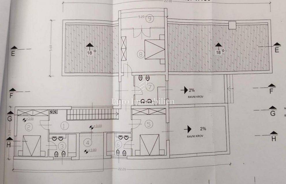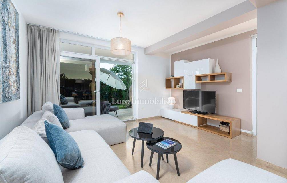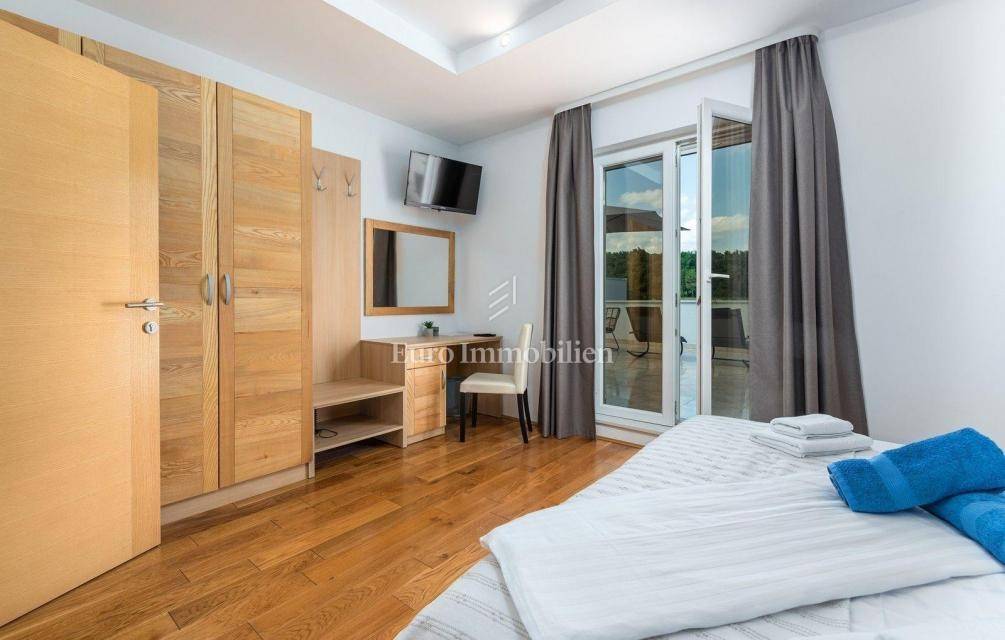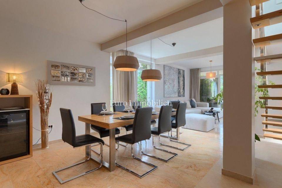 This beautiful villa has two swimming pools, indoor and outdoor, as well as a sauna and a fitness room, one part of the house is designed as a wellness area. The indoor pool is heated, so the pool can be used throughout the year. The house of 350 m2 consists of a ground floor and a first floor. On the ground floor, in addition to the wellness area, there is a hallway, storage room, wardrobe, toilet, garage, boiler room, kitchen with dining room, living room with access to a covered terrace and garden. Internal stairs lead to the first floor where there are four bedrooms, each with its own bathroom. Two rooms have their own balconies. The heating system is via a heat pump - floor heating, hair dryers are in the rooms, while solar panels are installed for hot water. In the garden there are several parking spaces, a small playground for children, a barbecue, a lawn with automatic irrigation, Mediterranean plants and an outdoor pool of 40 m2 with terraces. The garden is surrounded by a wall and a green fence, so privacy is guaranteed. The villa was built in 2014, but renovated in 2022. It is located in an established tourist rental that can be continued.