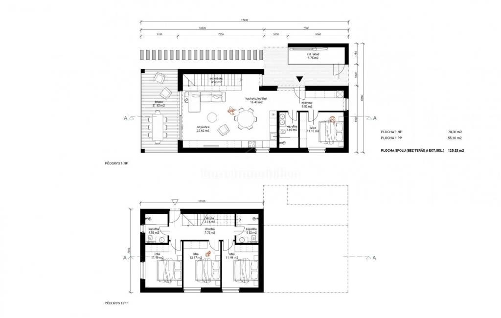 In the basement, there is a hallway, toilet, laundry, bathroom, three bedrooms, pergola, uncovered terrace and pool. The ground floor has a kitchen + dining room + living room, hallway, bedroom, bathroom, entrance hall and covered terrace. Construction will begin in September 2023, and move-in is planned after the summer of 2024.