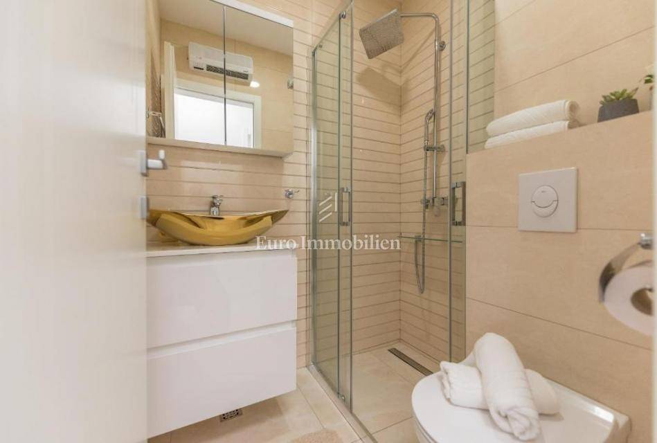This beautiful apartment is extremely rarely used, it is fully furnished with new furniture, air-conditioned, and is being sold as such. During the construction, the highest quality materials were used, such as top-quality sound and thermal insulation, oak parquet in the bedrooms, air conditioning, high-quality ceramic tiles in the bathroom and living room, underfloor heating in the fully equipped bathroom, new washing machine, security door at the entrance to the apartment, new LCD TV, satellite and internet connection in every room and external PVC windows.