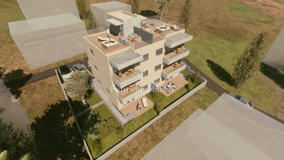 The property consists of six residential units on the ground floor, 1st and 2nd floor. On each floor there are one two-bedroom and one one-bedroom apartment. On the northeast side of the building there is the sea and a wonderful view towards Velebit and Paklenica, all apartments are organized so that the living areas are oriented towards this view. The roof is designed as a walkable roof terrace that can be reached from the staircase.