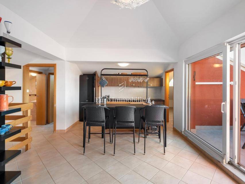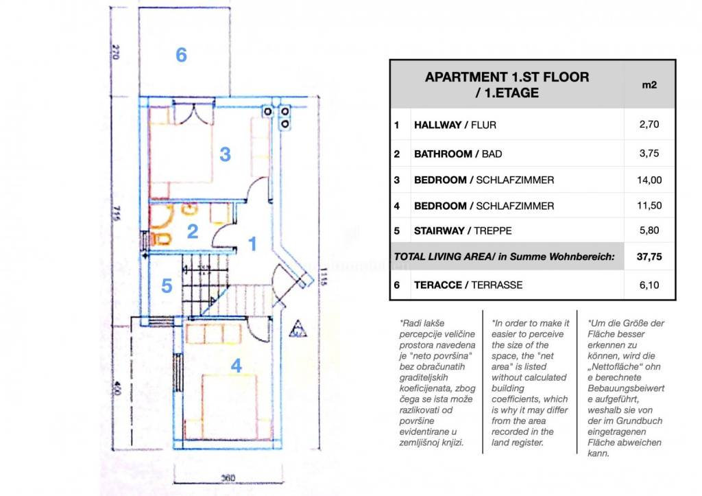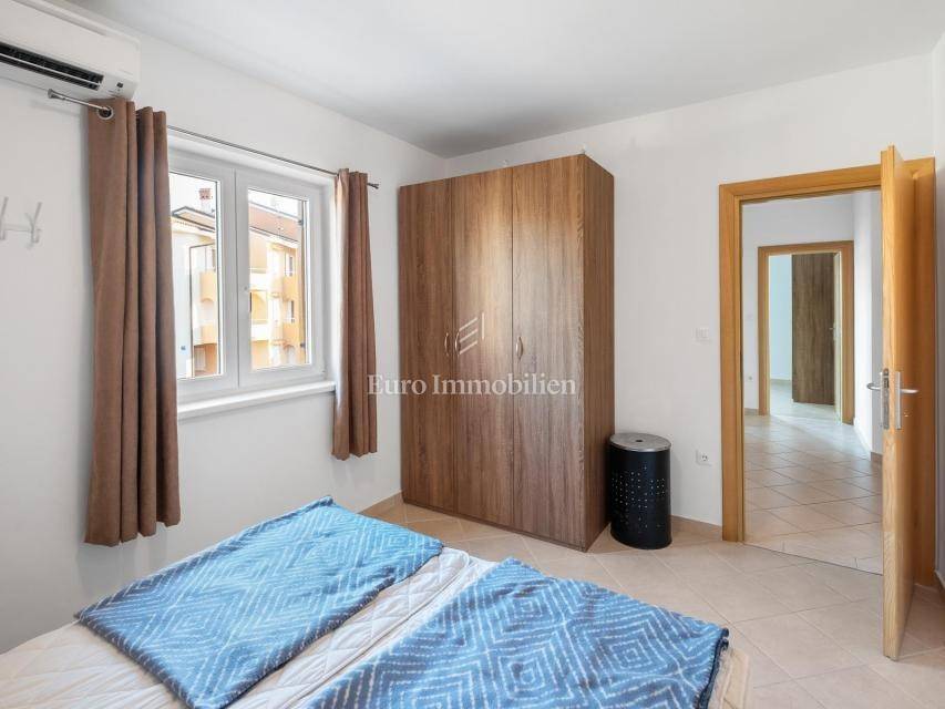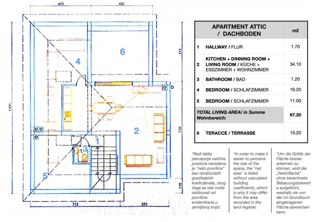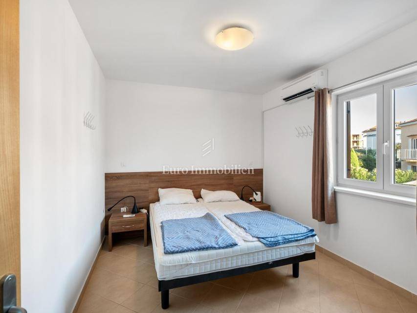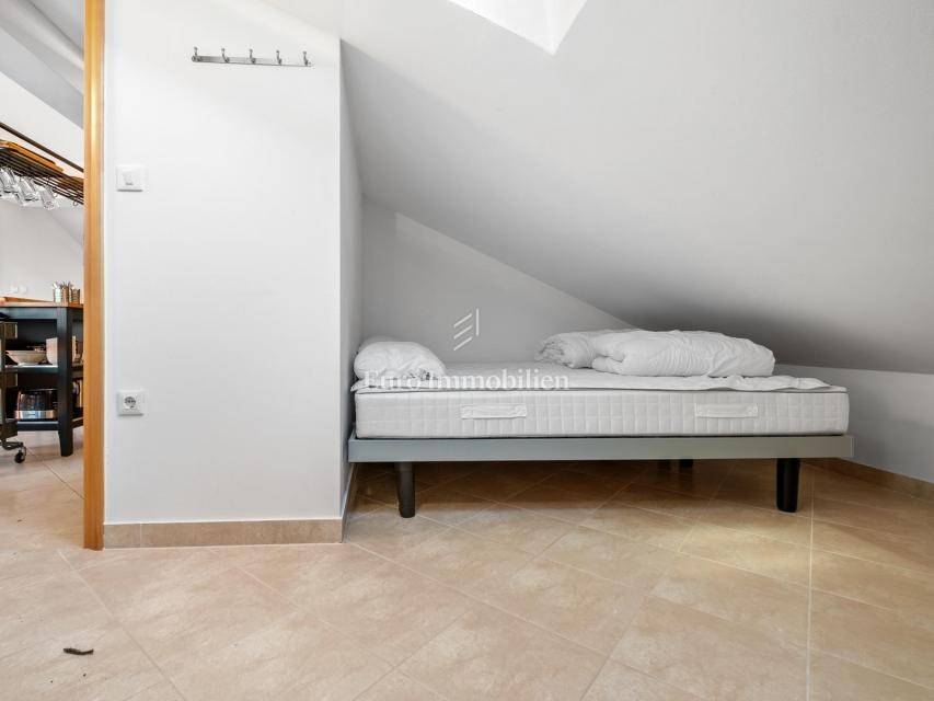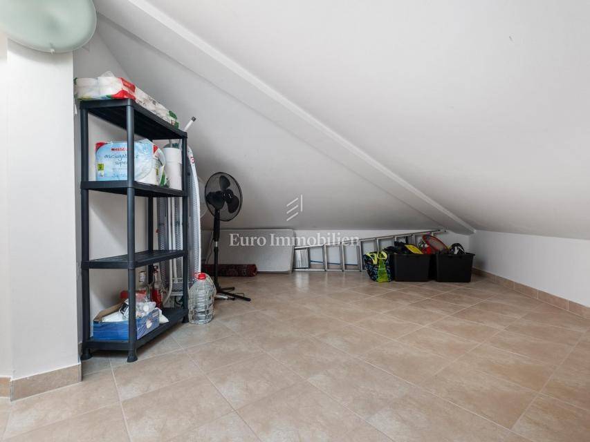 Two-story apartment with an area of 126 m2 extends to the first floor and the attic. The first floor consists of a hallway, a bathroom, two bedrooms, a balcony and a staircase. The attic consists of a hallway, a kitchen with a dining room and a living room, two bedrooms, a bathroom and a balcony with a view of the sea. It has one parking space. There is a communal swimming pool within the building.