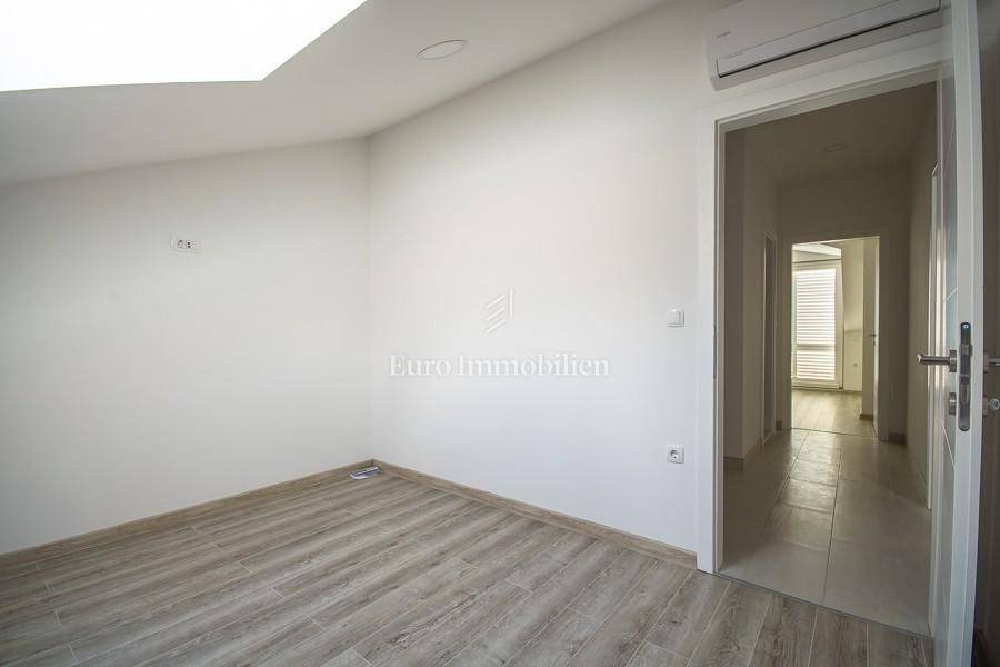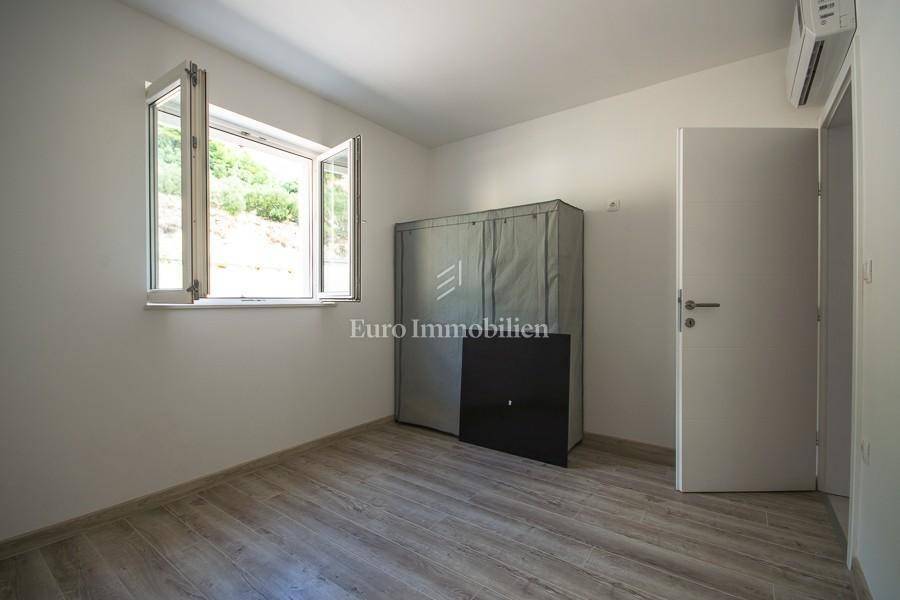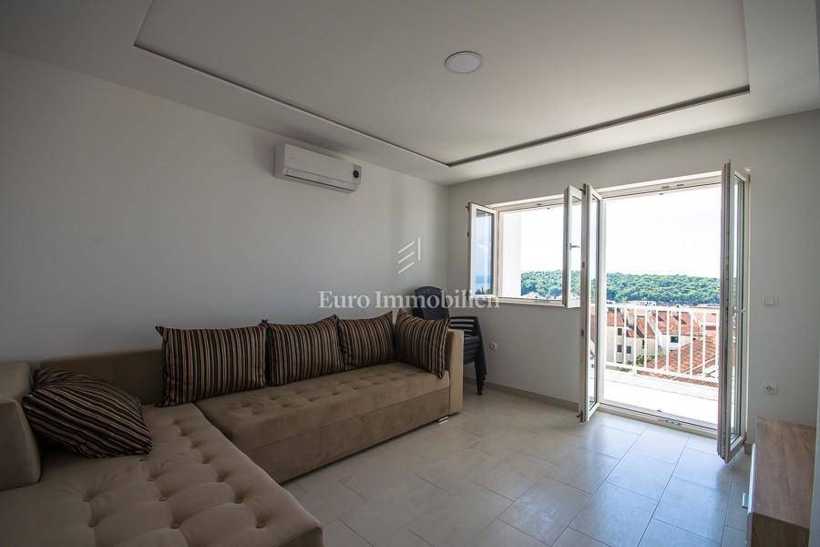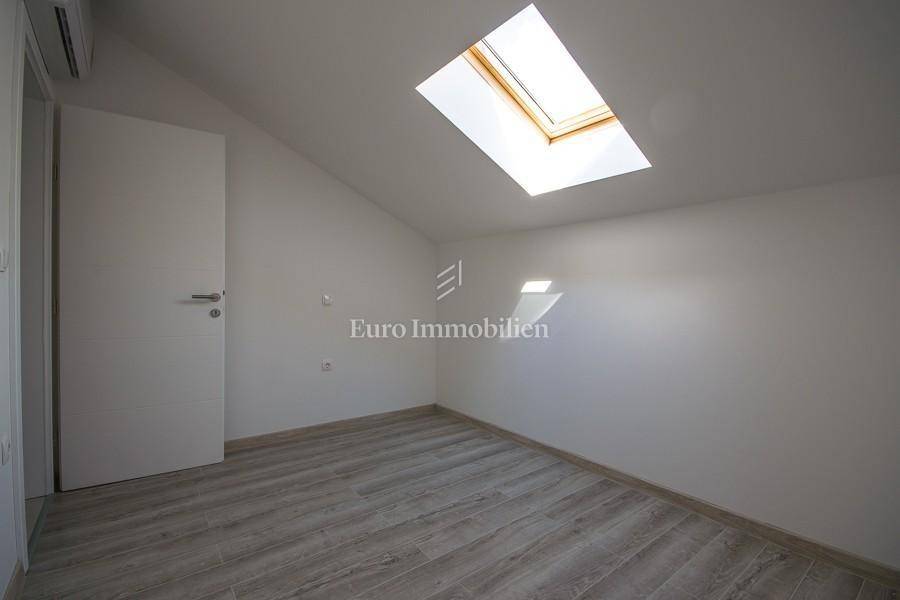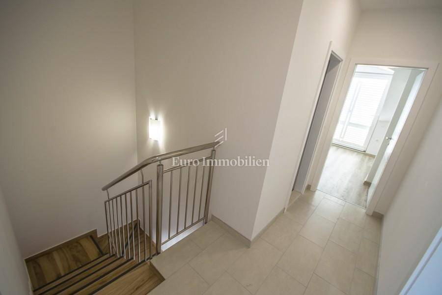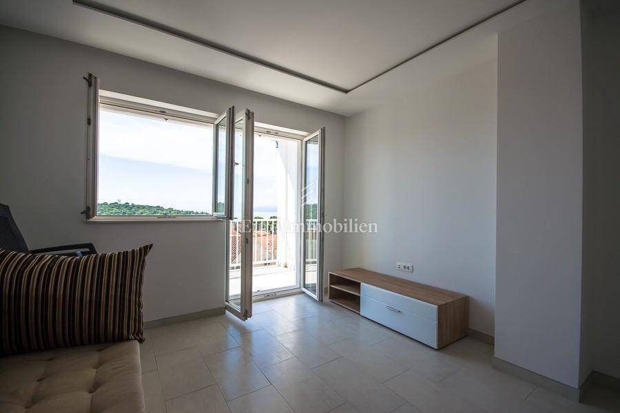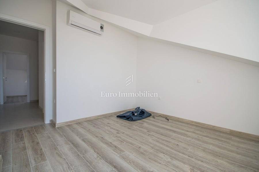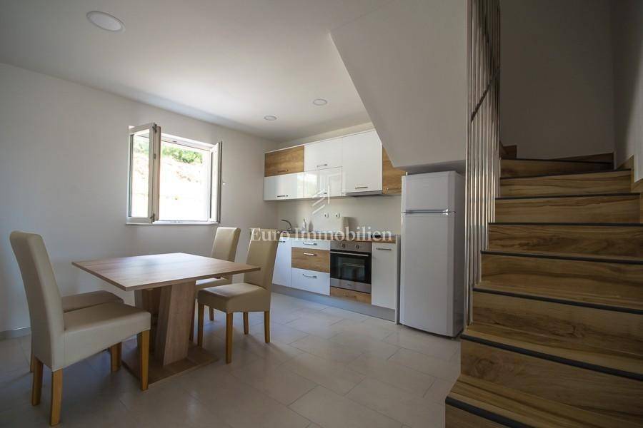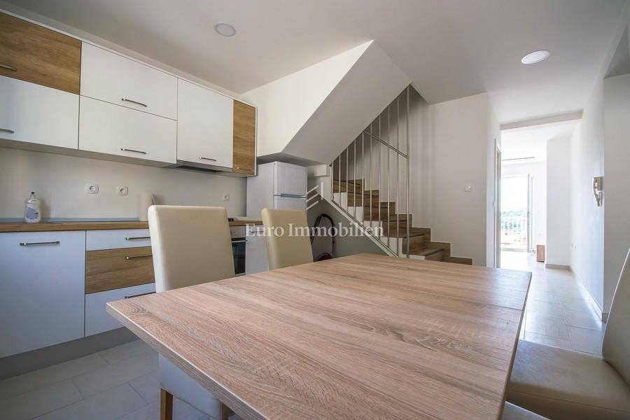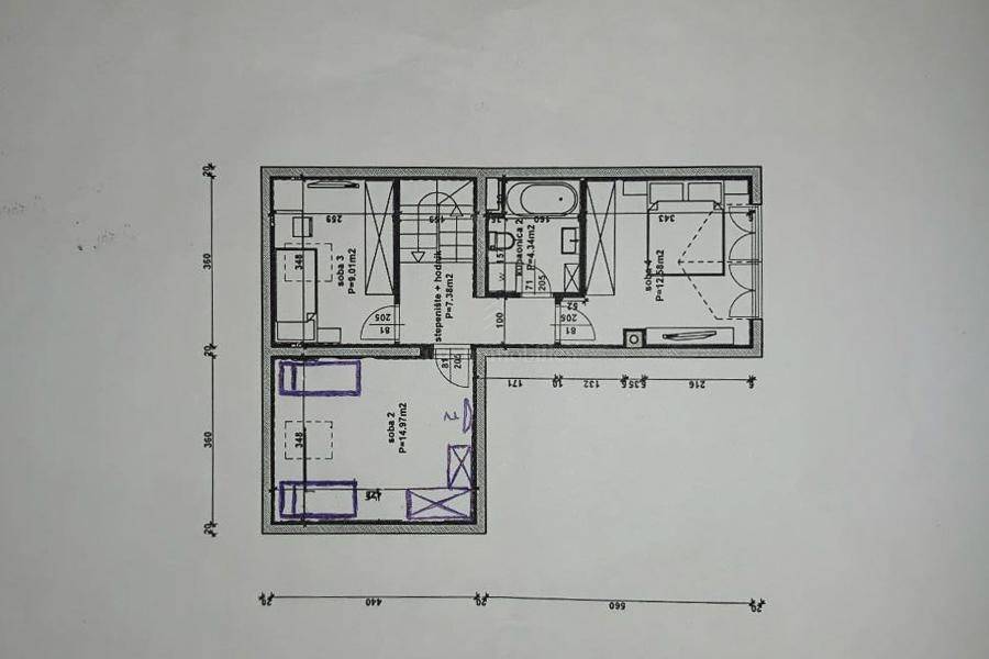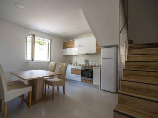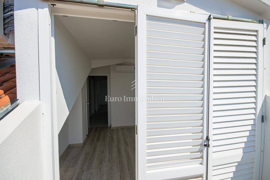A four-room apartment of 108 m2 is located on the 3rd floor of a residential building without an elevator, oriented north-south. The apartment consists of two floors. On the first floor there is a kitchen, dining room, bathroom, bedroom and living room with access to the loggia, and internal stairs leading to the second floor. On the second floor there is a hallway, three bedrooms, a bathroom and a balcony with a view of the sea and the city. The apartment is completely renovated, equipped with five air conditioners, a kitchen and a sofa. Shared parking available in front of the building.