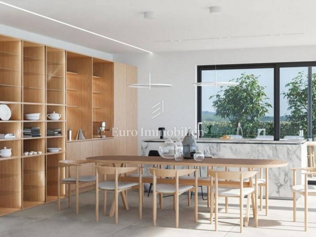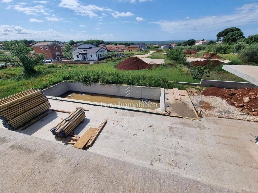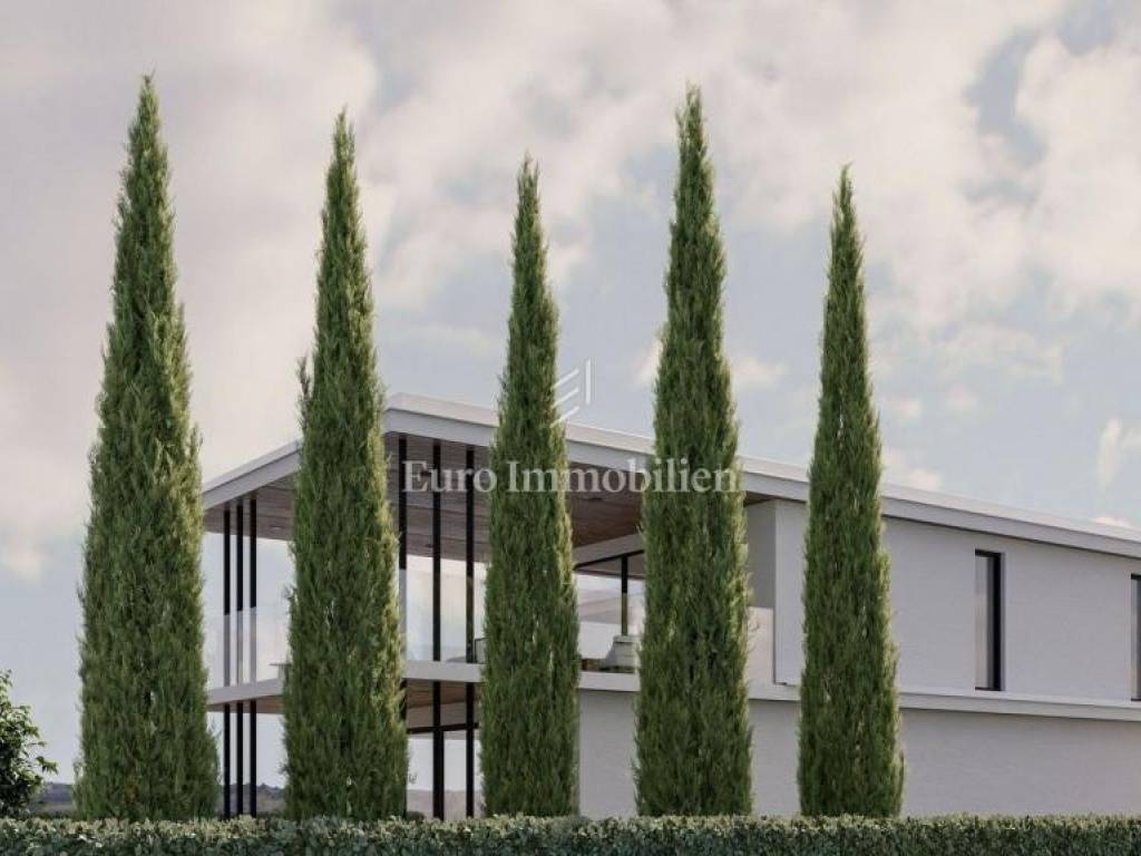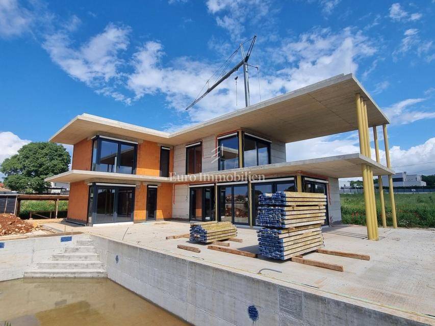A beautiful villa of modern design is for sale, located in a small Istrian town not far from Poreč, only 8 km from the sea. It has a net usable area of 330.50 m2, and is located on a plot of 971 m2. It extends to the ground floor and first floor. On the ground floor there is an entrance hall, a large spacious living room - open space concept that is designed for the kitchen, dining room and living room, one bedroom with its own bathroom, toilet and storage room. The living room and the room have access to the terrace, garden and pool. Internal stairs lead to the first floor where there are three more bedrooms, each with its own bathroom. The master bedroom has access to a spacious covered terrace with a partial view of the sea. A large swimming pool and parking spaces are provided in the garden. The heating is underfloor with a Mitsubishi air-water heat pump, the cooling is a Mitsubishi multisplit. The exterior joinery is aluminum with blinds, mosquito nets and electric lifters. The entrance door is Pivot, while the interior door is Invisible, 2.30 meters high. Ceramics measuring 120 x 230 cm are provided in the bathrooms, and ceramics measuring 12 x 4 cm in the pool. The house is sold with installed ceramics and sanitary ware, installed parquet and ceramic floors, but without furniture.