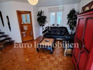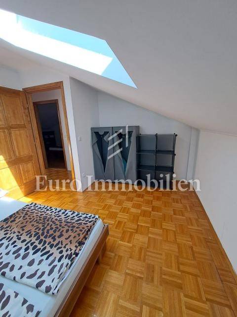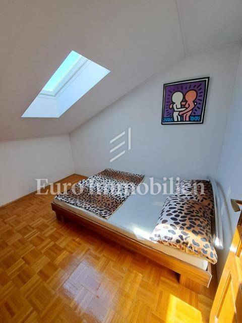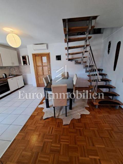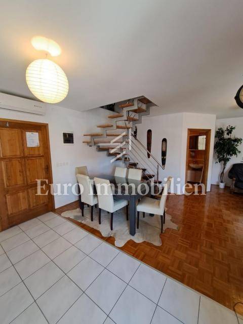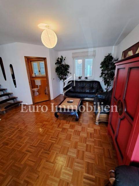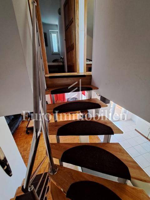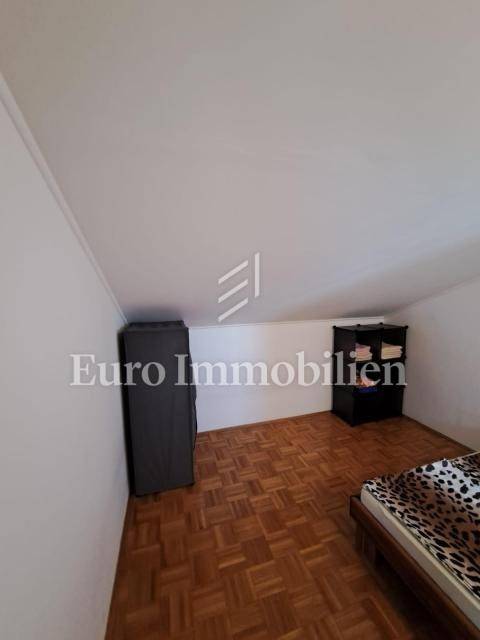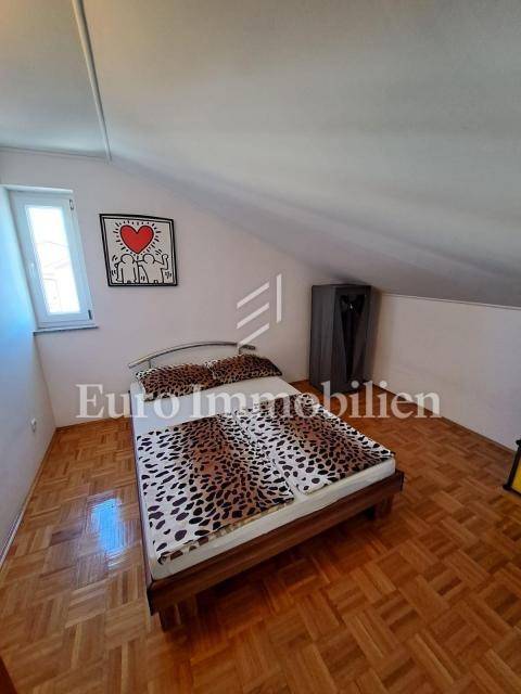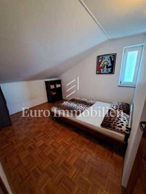 The apartment extends to the first floor and the high attic of a residential building with a total of four residential units. The apartment has a garden of 57m2 and two parking spaces. On the first floor there is a living room, a kitchen and a dining room, as well as a bathroom and a loggia. An internal staircase leads to the second floor in the loft, which consists of three bedrooms and a toilet. The apartment is fully furnished and equipped and is being sold as such. It has PVC joinery and one air conditioner on each floor. Heating is also possible with solid fuels. The property is located in a great location near the center of Krk and all the necessary amenities. Opportunity!