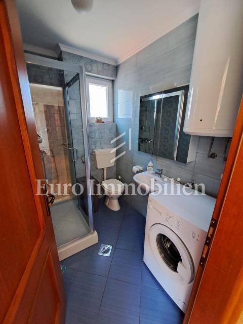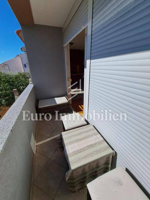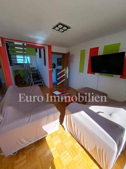 The apartment has two parking spaces. An external staircase leads to the entrance. It consists of an open space living room, kitchen and dining room, bathroom, and balcony on the first floor. An internal staircase leads to the apartment's second floor, with three bedrooms and bathrooms. The apartment is fully furnished and equipped and is being sold as such. It has PVC joinery and is air-conditioned. Heating is also possible with solid fuels. The property is located in a great location near the center of Krk and has all the necessary facilities. Opportunity!