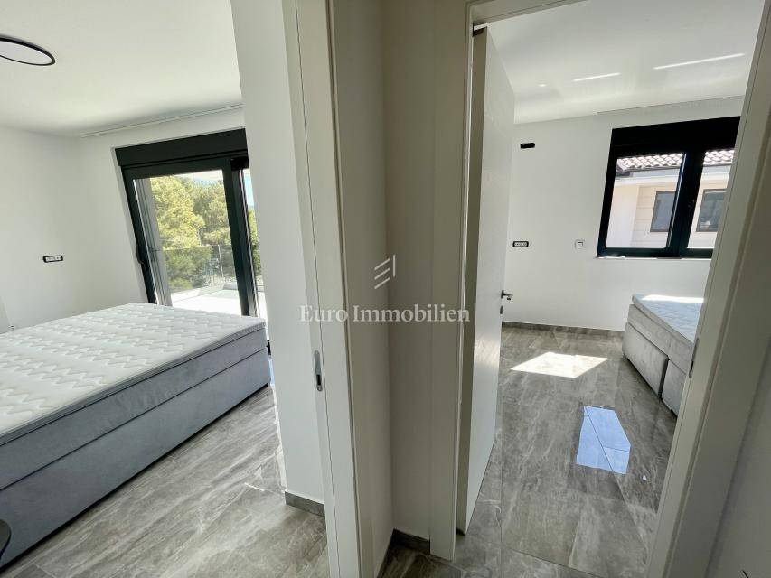 The building is built with quality materials, the apartment is equipped with air conditioning, underfloor heating in all rooms, ALU windows and quality ceramic coverings. The apartment has two parking spaces and a garden area of approx. 70 m2 with a swimming pool and a sunbathing area. The property is located in an excellent location approx. 450 meters from the sea and the beach.