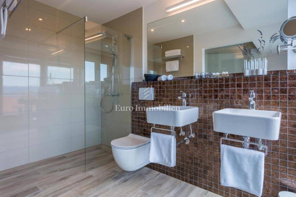 The villa with a living area of about 223 m² extends over three floors. In the basement there is a wellness area with a sauna, a bathroom, a boiler room and a storage room. The ground floor consists of a kitchen and dining room, a toilet, and a spacious living room that opens onto a covered terrace. An internal staircase leads to the first floor where there are three bedrooms, each with its own bathroom and a terrace with a beautiful view of the sea. There is a swimming pool, sunbathing area, barbecue and parking for several vehicles on the landscaped garden, which offers a view of the sea.