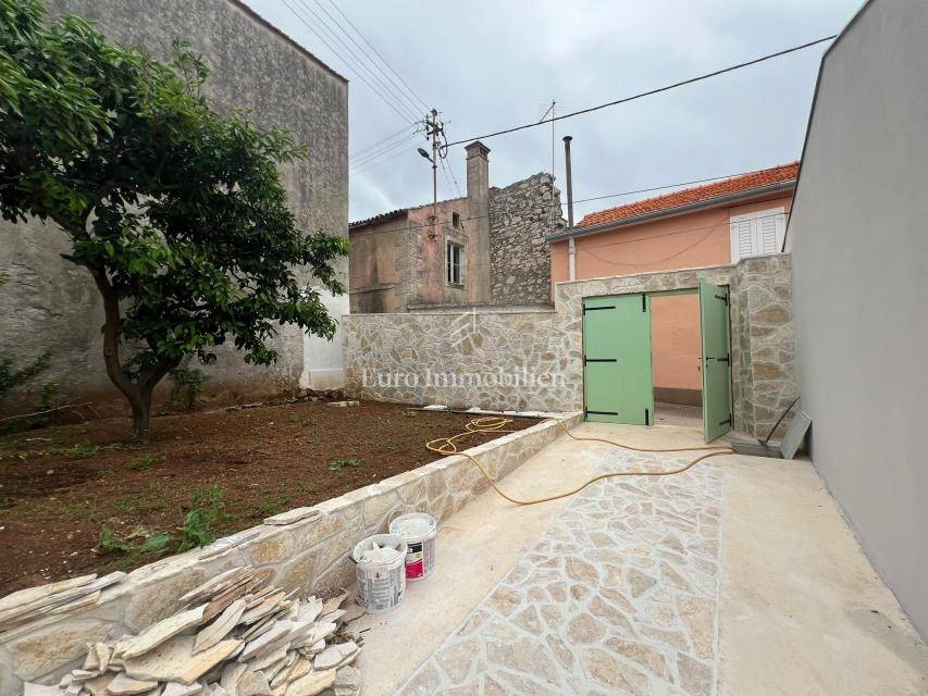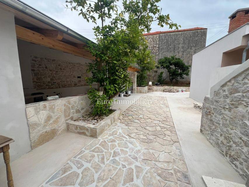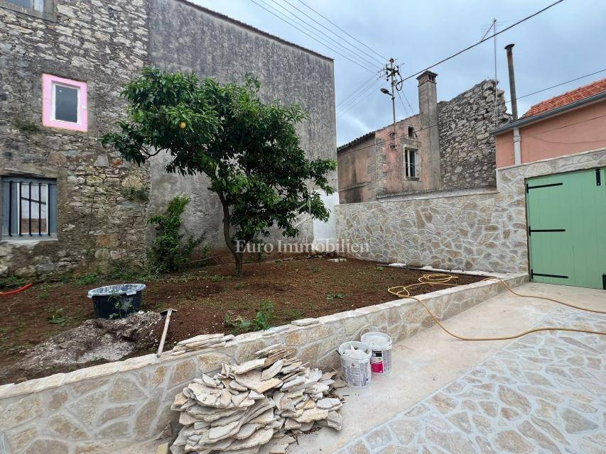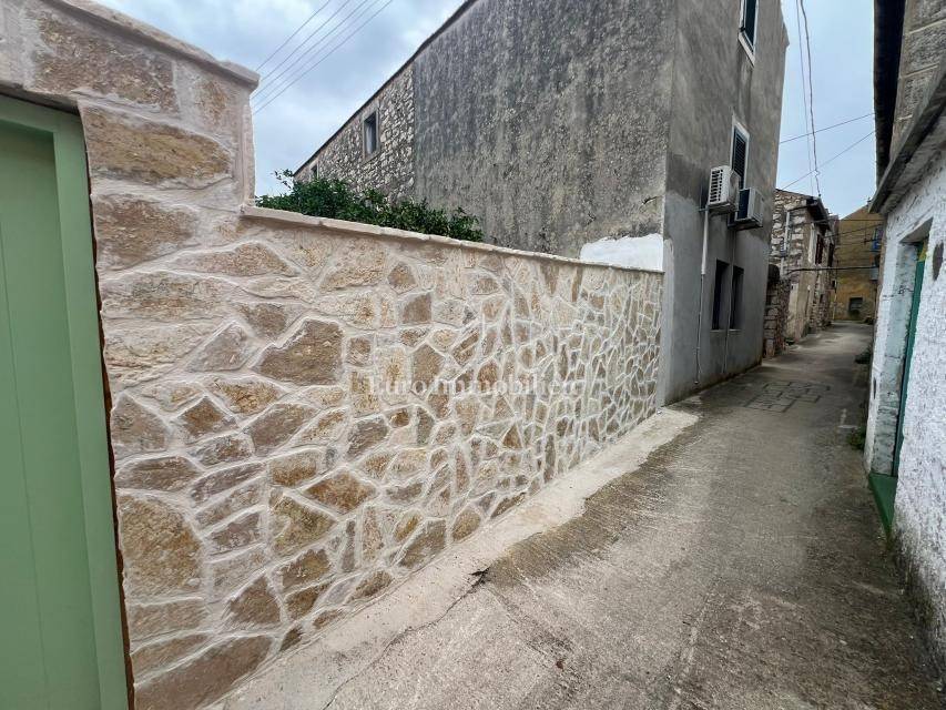 Rustic stone house for sale in the center of Sutomišćica on the island of Ugljan. The property extends to the ground floor and the first floor. On the ground floor there is a living room, a toilet, and a studio apartment / room with a bathroom. The first floor is reached by an external staircase, where there are two bedrooms with private bathrooms and a large terrace. The yard is paved with Benkovac stone, enriched with Mediterranean herbs, olives and lemon trees. As part of the yard, there is also a covered outdoor tavern (konoba) with a grill, which can be closed, and is designed as a summer kitchen where a large TV is also installed.