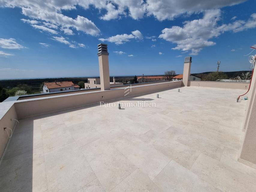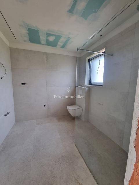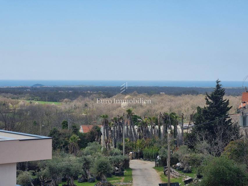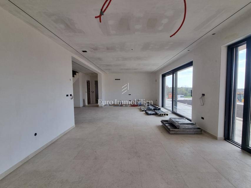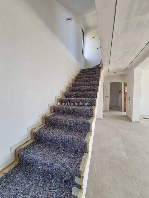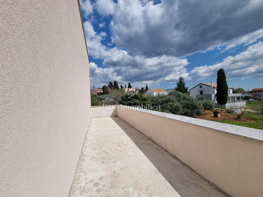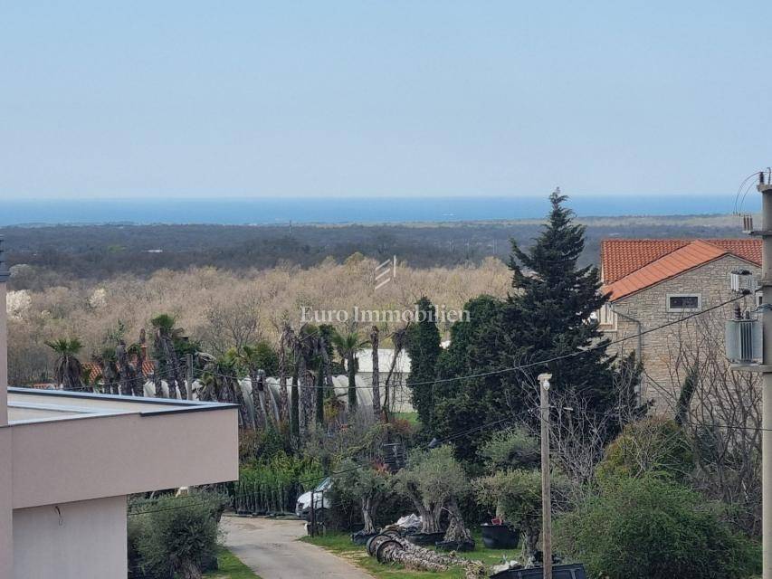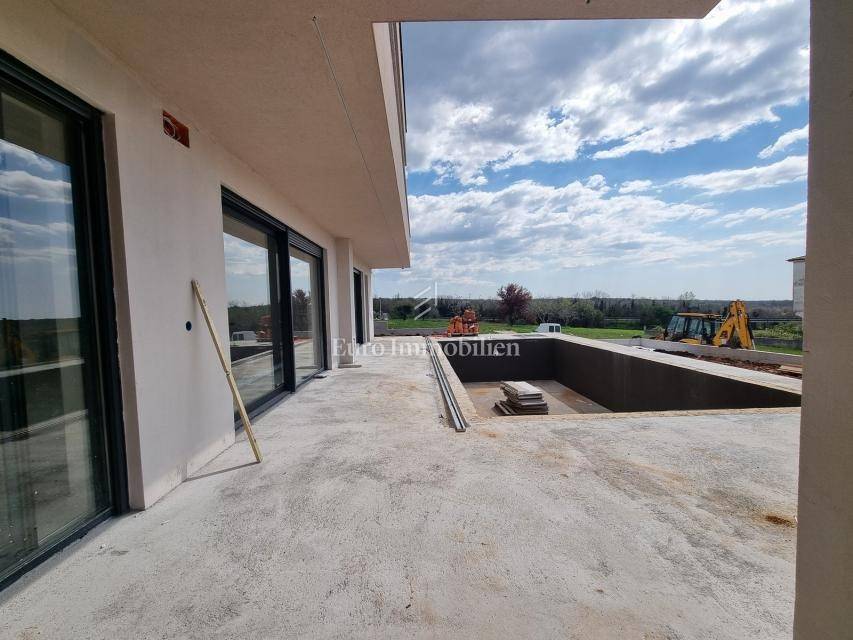 A beautiful villa of modern design is for sale, which is being built in a small Istrian town not far from Poreč and the sea (14 km). The planned completion of the works is in 2025. It consists of ground and first floor. On the ground floor there is an entrance hall, entrance hall, toilet, technical room, engine room, large living room with dining room, kitchen and living room, storage room, bedroom with its own bathroom. From the living room and bedroom there is an exit to a spacious covered terrace (38.7 m2), garden and swimming pool. Internal stairs lead to the first floor, where there are three more bedrooms, each with its own bathroom. On the first floor there is a large terrace partly covered (22.10 m2), partly uncovered (14.6 m2, 15.6 m2) with a view of the sea. The villa also has a second floor, i.e. a roof terrace of 87 m2 with a panoramic view of the sea and nature. All installations for sauna and Jacuzzi will be provided on the terrace. Sold without furniture. Heating is provided under the floor via a heat pump, and air conditioners will be installed. The joinery is PVC with electric blinds. Installations for alarm and video surveillance will be installed. A heated swimming pool of 40 m2 will be built in the garden, and three parking spaces are planned. There is a possibility of an agreement with the investor while it is under construction for some minor modifications and the choice of materials, such as ceramics, sanitary ware, and colors in the space can be influenced.