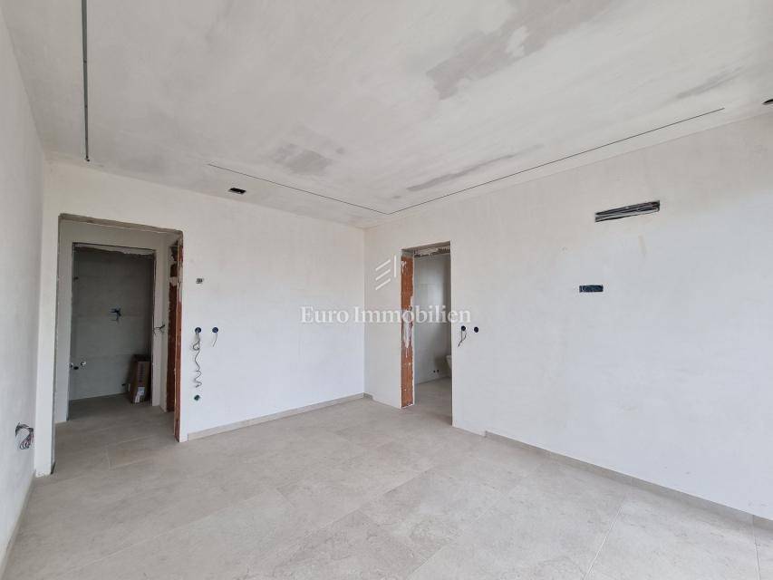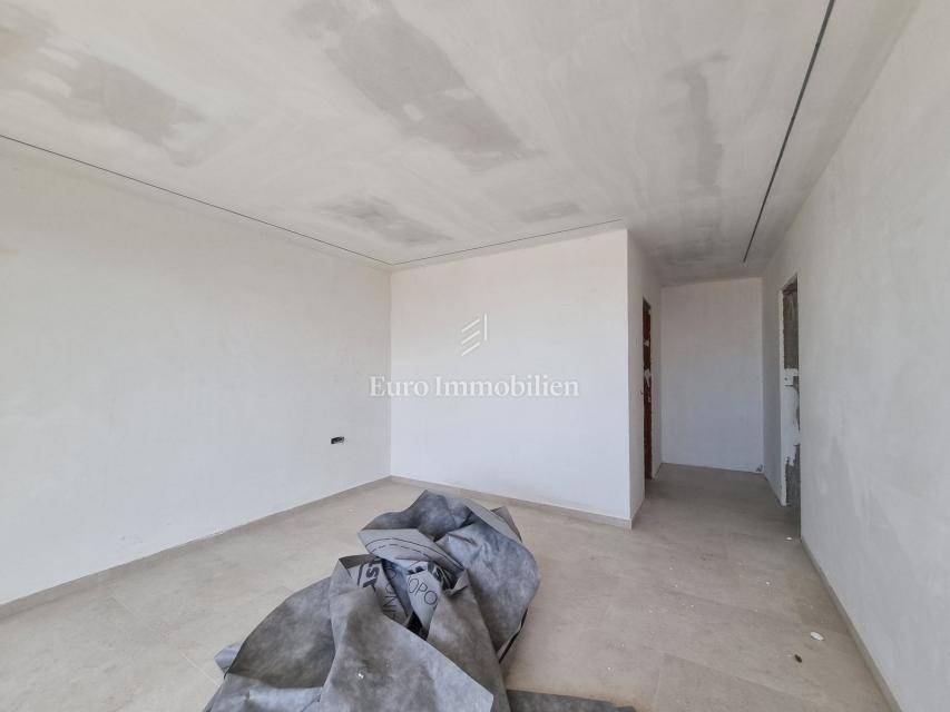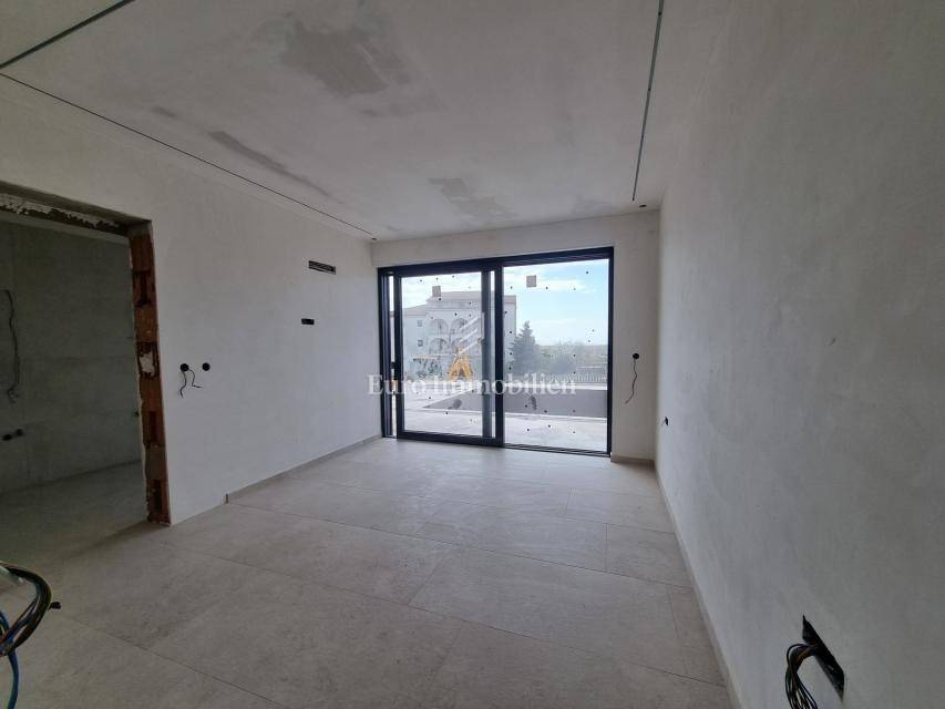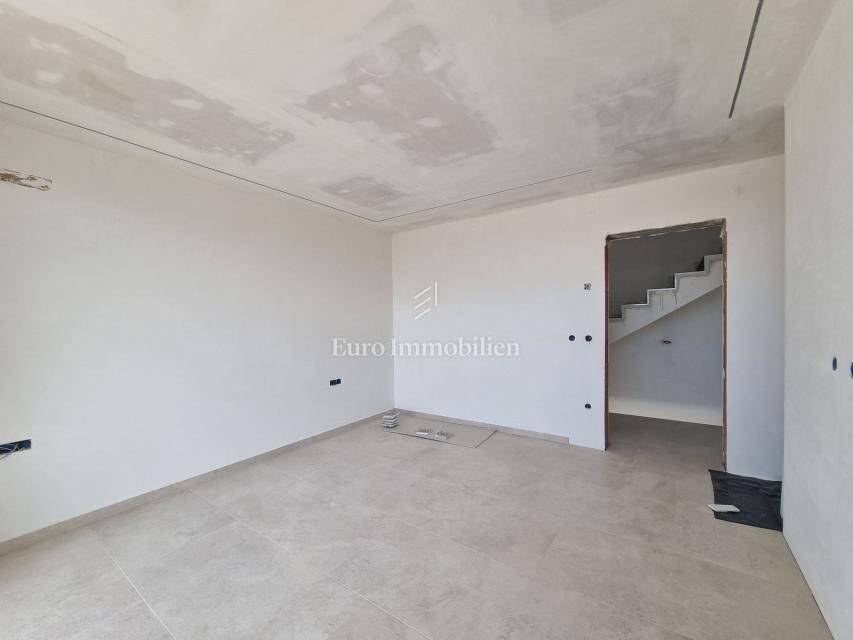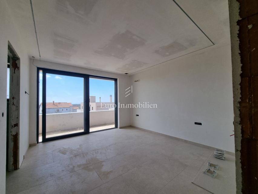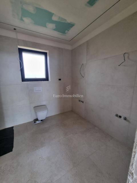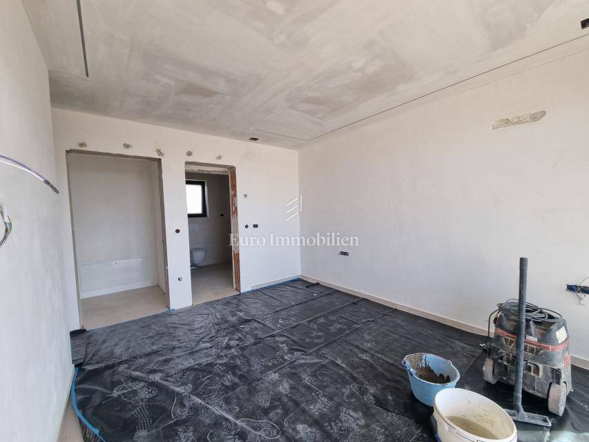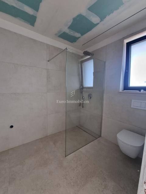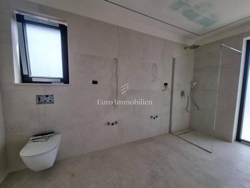 A beautiful villa of modern design is for sale, which is being built in a small Istrian town not far from Poreč and the sea (14 km). The planned completion of the works is in 2025. It consists of ground and first floor. On the ground floor there is an entrance hall, entrance hall, toilet, technical room, engine room, large living room with dining room, kitchen and living room, storage room, bedroom with its own bathroom. From the living room and bedroom there is an exit to a spacious covered terrace (38.7 m2), garden and swimming pool. Internal stairs lead to the first floor, where there are three more bedrooms, each with its own bathroom. On the first floor there is a large terrace partly covered (22.10 m2), partly uncovered (14.6 m2, 15.6 m2) with a view of the sea. The villa also has a second floor, i.e. a roof terrace of 87 m2 with a panoramic view of the sea and nature. All installations for sauna and Jacuzzi will be provided on the terrace. Sold without furniture. Heating is provided under the floor via a heat pump, and air conditioners will be installed. The joinery is PVC with electric blinds. Installations for alarm and video surveillance will be installed. A heated swimming pool of 40 m2 will be built in the garden, and three parking spaces are planned. There is a possibility of an agreement with the investor while it is under construction for some minor modifications and the choice of materials, such as ceramics, sanitary ware, and colors in the space can be influenced.