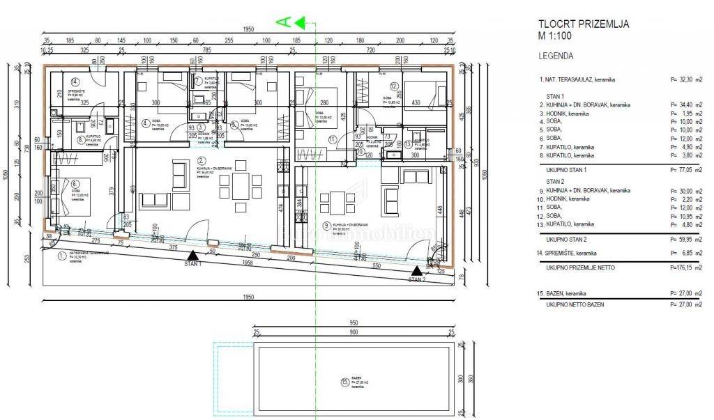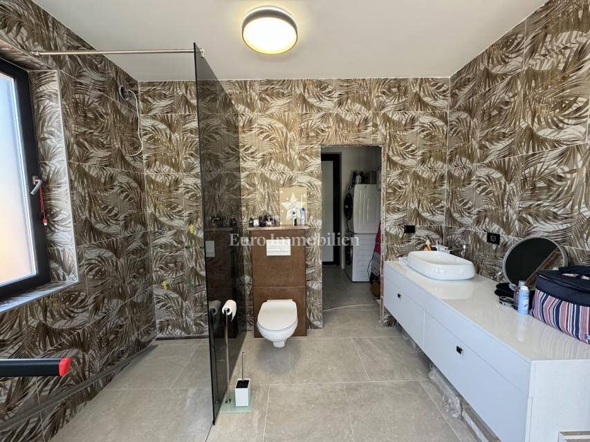 The villa with a total living area of 176.15 m2 is located on a plot of 792 m2. It consists of two residential units, i.e. a larger and a smaller part. Larger apartment: kitchen with dining room and living room, three bedrooms, two bathrooms and a storage room. Small apartment: kitchen with dining room and living room, two bedrooms and bathroom. The villa has access to the fenced outdoor area, where there is a private pool, sun terrace and barbecue. It is equipped with large glass walls that allow a lot of natural light into the space. The exterior carpentry consists of aluminum sliding walls and top-quality aluminum entrance doors, CORTIZO brand, and Kömmerling PVC carpentry with triple glazing is installed in the rooms and bathrooms. High-quality materials and equipment were used during construction. Heating and cooling is done with a floor heating system and inverter air conditioners.