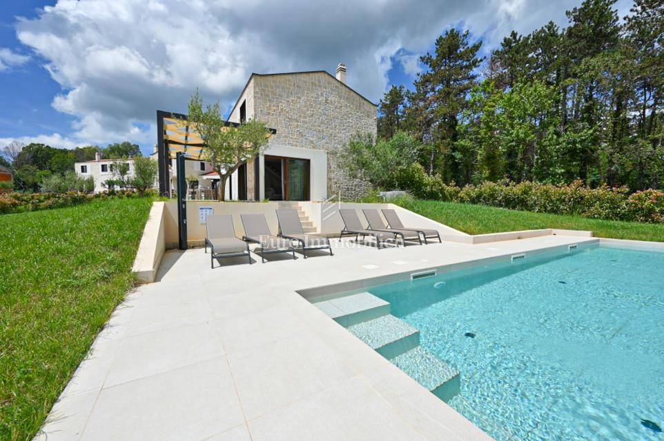 A detached house for sale with a swimming pool in a small Istrian village located 15 km from the center of Poreč and the beaches. The house with an internal living space of 190 m2 was built on a plot of land of 800 m2. It consists of two floors - the ground floor, where there are living spaces - open concept, bedroom, bathroom, storage room, utility, guest toilet and covered terrace. There are two bedrooms and two bathrooms on the first floor. There is underfloor heating and air conditioning. It is sold completely finished and equipped with quality furniture. There is a heated swimming pool with a sunbathing area on the fenced garden with irrigation.