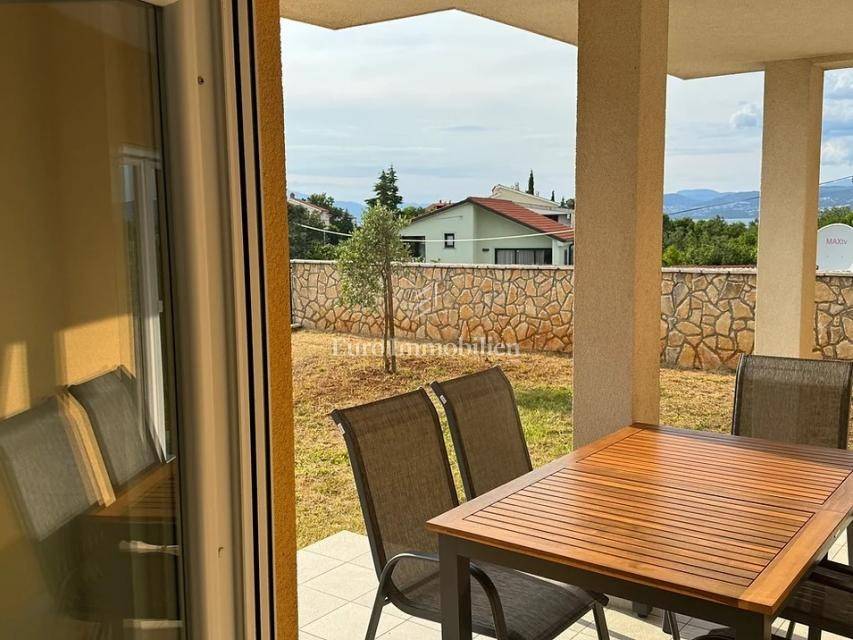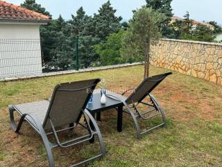 Island of Krk, Omišalj, two apartments with a garden of approximately 150 m2 are for sale. Each apartment consists of a living room with kitchen and dining area, two bedrooms, bathroom and terrace. One apartment is on two floors, and one is only on the ground floor. The apartments are sold with furniture and equipment, completely ready for use. They have a basement of 15 m2 and a parking space. Opportunity for own use or tourist rental.