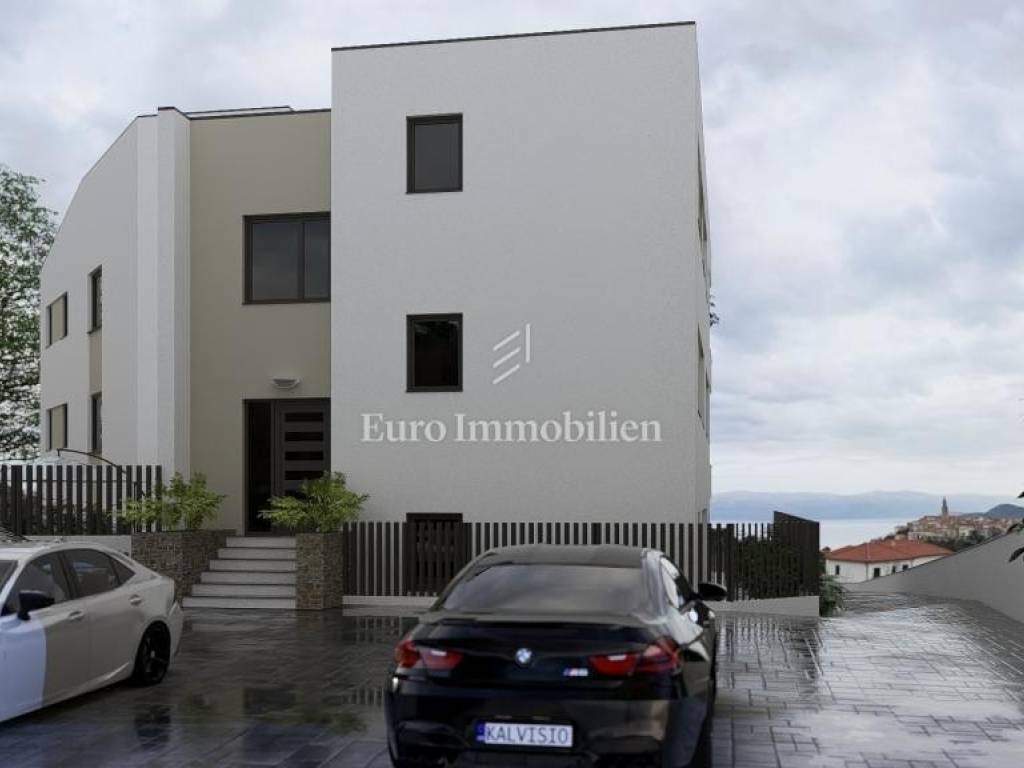 The apartment is located on the first floor and has an area of 100 m2. It consists of an open living room with kitchen and dining area, three bedrooms, two bathrooms, toilet and a large terrace with sea view. It is located in a quiet part of Vrbnik, 350 meters from the sea and 800 meters from the center. It is being sold on a turnkey basis, and the planned completion of the works is expected for the summer of 2026. High-quality materials and equipment will be installed, all rooms will be air-conditioned and each apartment will have a 2 designated parking spaces.