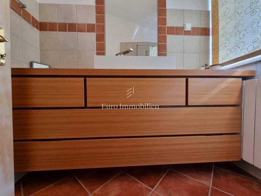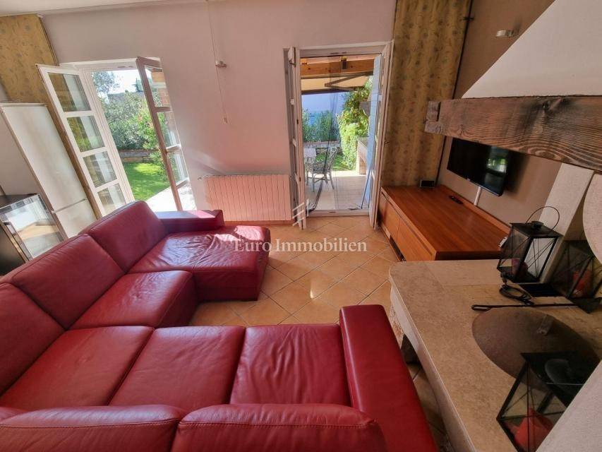 Beautiful semi-detached house is located in a quiet location not far from Poreč and only 1 km from the sea. It was built in 2006, and the owners renovated it in 2021, and are continuously maintaining it. They bought it and used it exclusively for their needs, the house has never been rented! It has a total of 155.55 m2 with terraces (135 m2 of closed space), on a plot of 367 m2. The garden has the surface of approx. 200 m2. The house consists of a ground floor and a first floor, it has a Mediterranean-rustic style. On the ground floor there is a hallway, a bedroom, a bathroom, a large living room with a fireplace and a kitchen with a dining room. From the living room and the kitchen there is access to the covered terrace where there is another fireplace and dining table, and to the garden. Upstairs there are two more bedrooms, each with its own bathroom, which share a spacious covered terrace. The terrace is connected to the garden by an external staircase. The garden is beautifully landscaped with Mediterranean plants, an old olive tree, landscaped lawn, and a 30 m2 swimming pool. Next to the pool, a small stone garden house of 7 m2 has been built, where everything is prepared for the sauna or can be used as a storage room. There is an outdoor shower next to the pool and the house. The house has 2 parking spaces. The entire garden is enclosed by a wall, greenery or a metal fence. In the back of the house, near the pool, there is a storage room/boiler room and a summer kitchen. The house is for sale with custom-made furniture for the entire house. The heating is regulated centrally on heating oil. Portable air conditioning is installed only in one bedroom. An alarm and a video camera were also installed. The house can be moved into immediately!