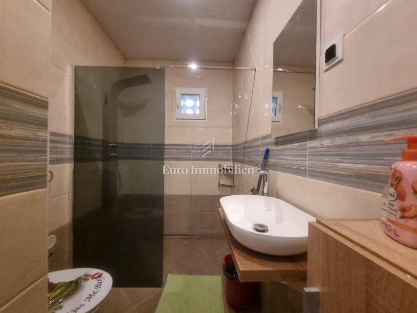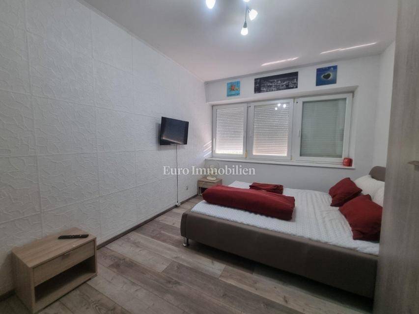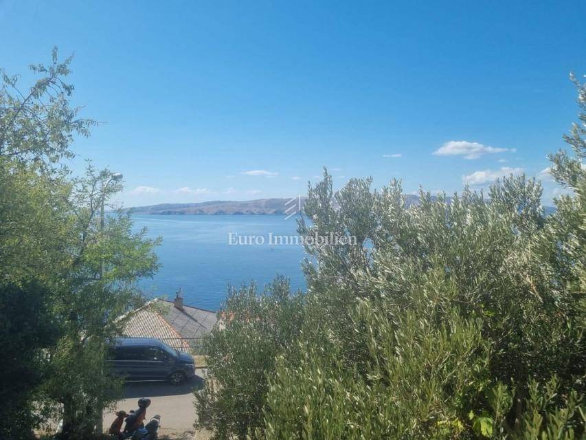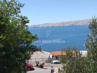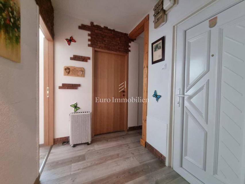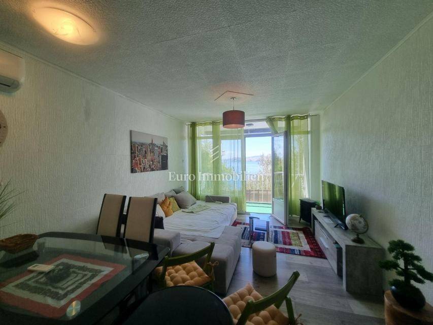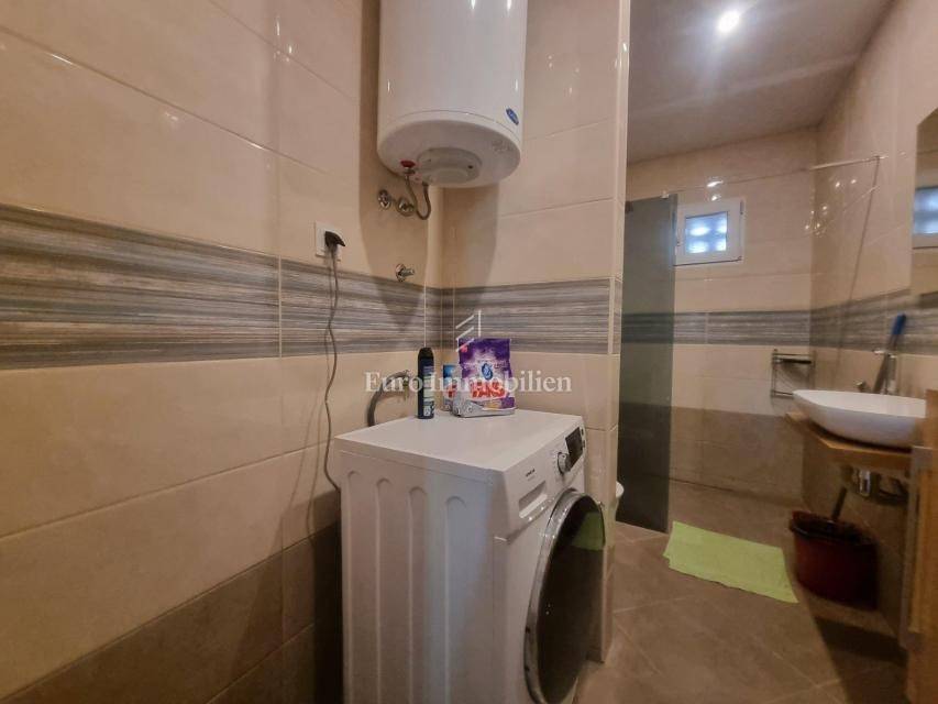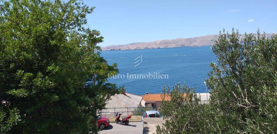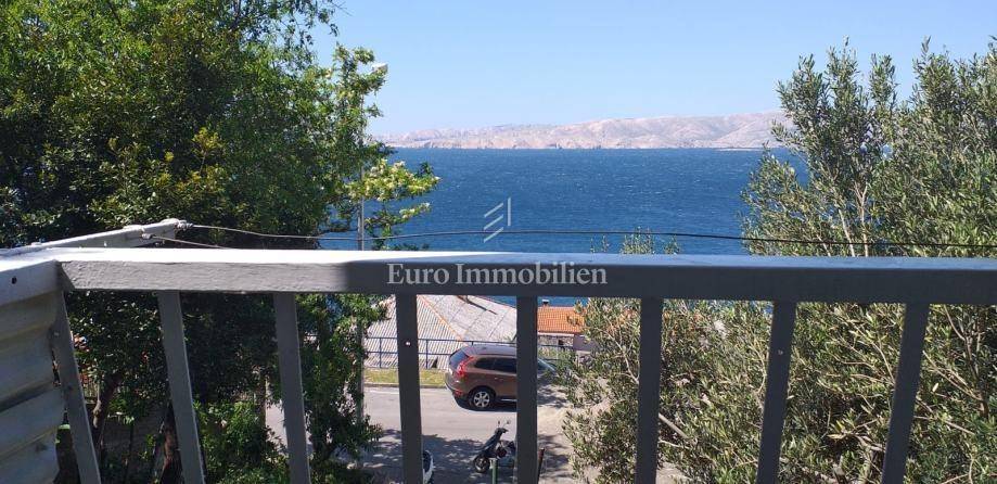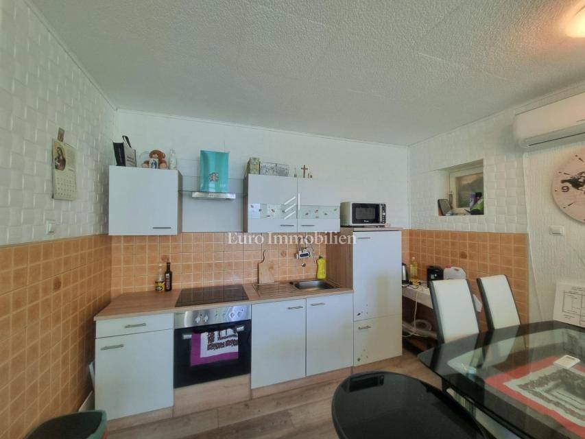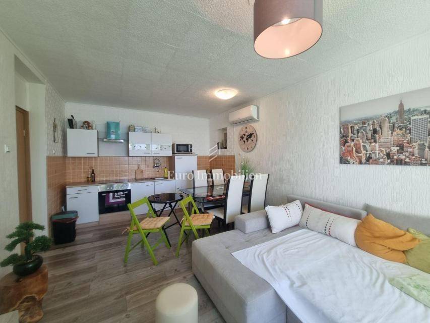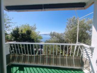 An apartment for sale on the high ground floor of a residential building with a beautiful view of the sea. The apartment consists of one large room, bathroom, hallway, pantry, living room with kitchen and balcony. The apartment has a woodshed. The apartment is fully furnished and ready for use. Renovated in 2022. Property for year-round stay, but also for tourist rental.