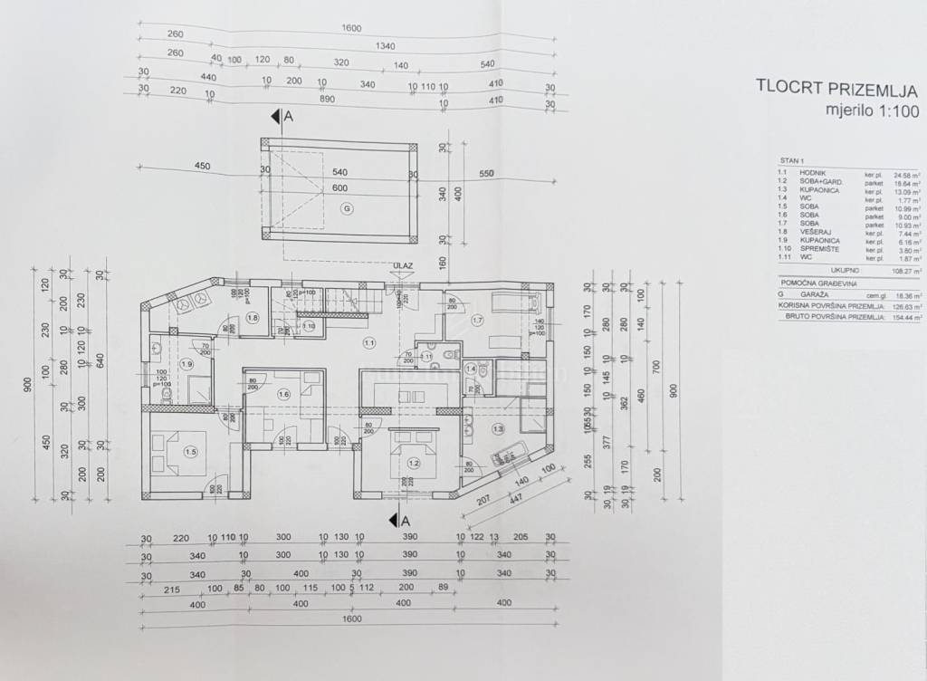 The house is built on a 766 m² plot and consists of two floors. The ground floor has a gross area of 154.44 m², including an 18 m² garage, and also features the main entrance to the house. It comprises four bedrooms, one of which has a walk-in closet, a private bathroom with a shower, bathtub, and toilet, as well as a room intended for wellness. Additionally, the ground floor includes another bathroom with a toilet, a guest toilet, a storage room, and a laundry room with a technical room.