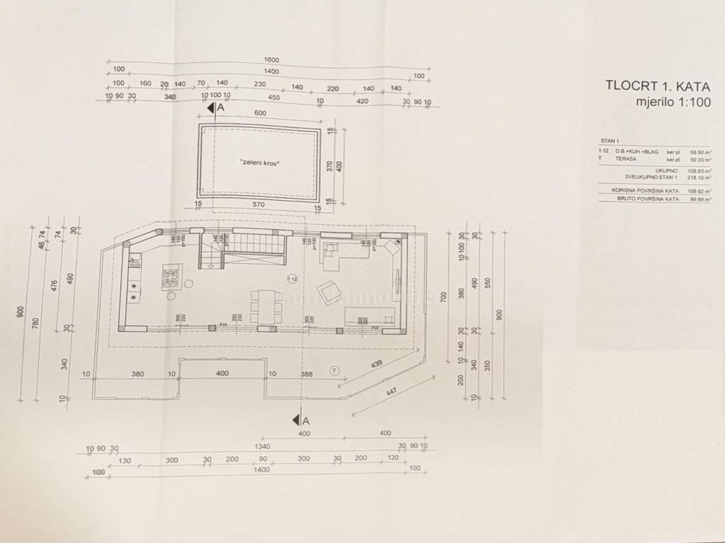 An internal staircase leads to the first floor, which has a total usable area of 109.83 m². Here, you'll find a spacious open-plan living area with a kitchen and dining space, which opens onto a 50.33 m² terrace.