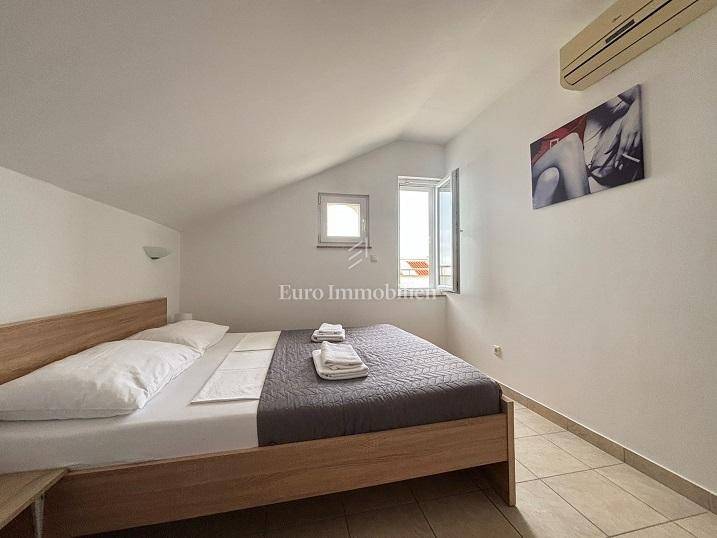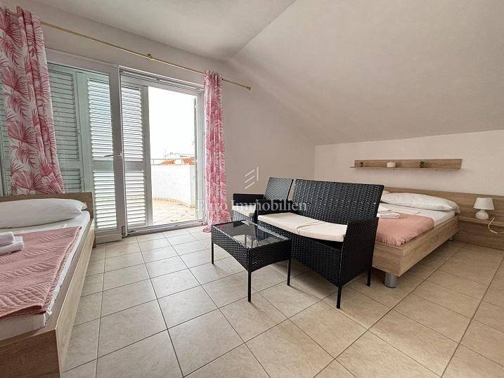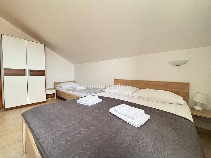 The apartment is located on the second floor (28.69 m2) and in the attic (39.16 m2). It is fully furnished and air-conditioned. The apartment also includes two parking spaces. The sea and the center of Novalja are about 10-15 minutes away on foot.