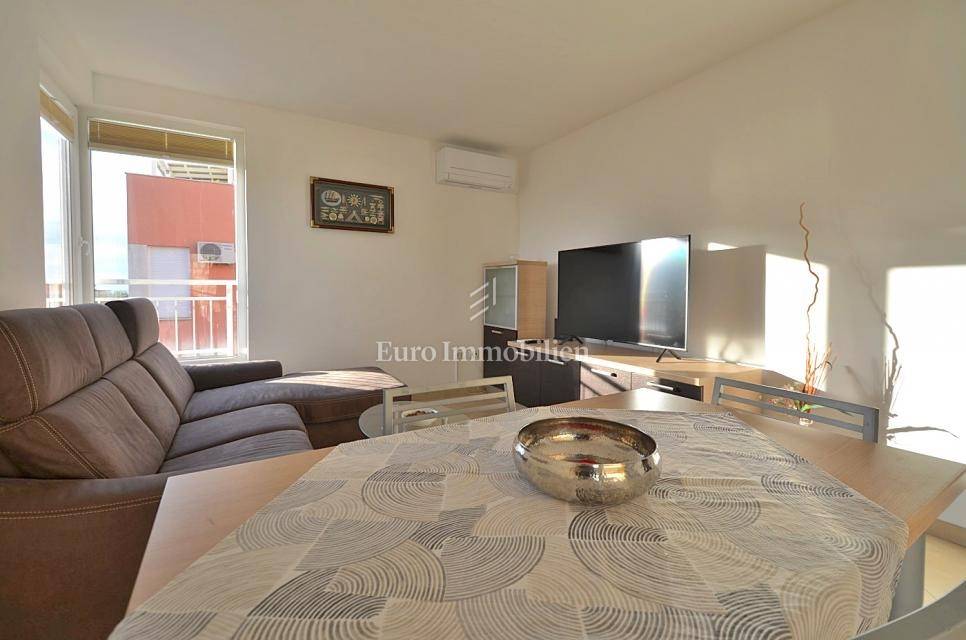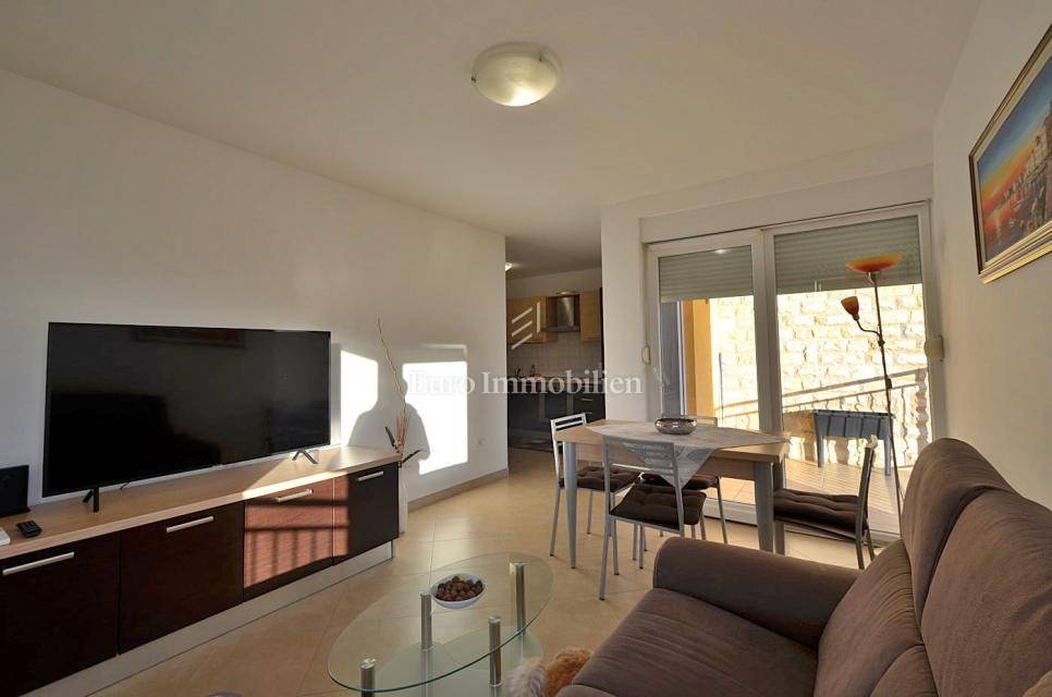 It consists of two bedrooms, and is equipped with a kitchen with appliances, which provides a comfortable living space. It also has a 5 m2 woodshed, and a terrace with a sea view. Air conditioning is used for heating and cooling, ensuring comfort throughout the year. The apartment has a parking space.