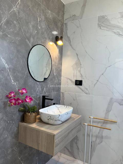 It consists of 3 bedrooms, 3 bathrooms + guest toilet. The main bathroom is luxurious, with two sinks, a walk-in shower and a freestanding bathtub. The villa is fully furnished with designer European furniture, and underfloor heating is in the bathrooms, kitchen and living room. The garden is maintained with carpet grass and an automatic irrigation system. There is also a lounge area, a covered terrace with a dining table, a gas barbecue, and a solar panel on the roof for heating water. Preparation for video surveillance and an alarm system.