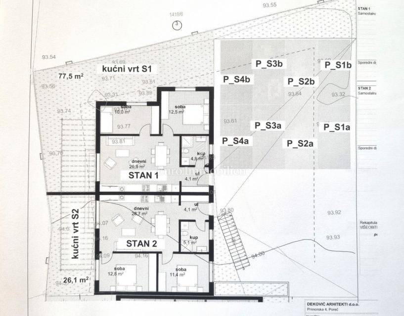Apartment 1 is located on the ground floor and consists of an entrance hall, two bedrooms, bathroom, living room, kitchen, dining room and terrace, as well as a 77.5m2 garden. The apartments will be completed up to the furnishing phase, including high-quality ceramics and sanitary ware, underfloor electric heating, air conditioning, and interior wooden and exterior PVC joinery. Each apartment has 2 parking spaces. The expected completion of construction is the end of 2026. The buyer is exempt from paying real estate tax!