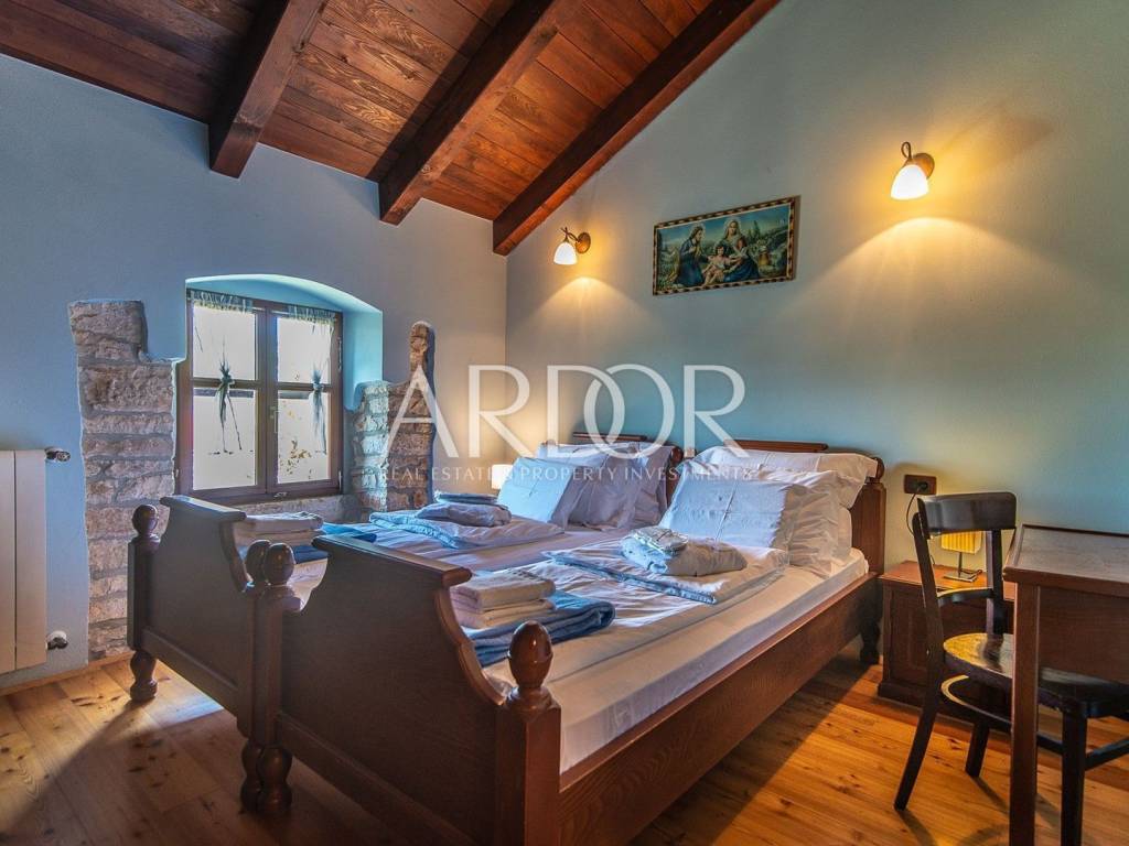 Žminj, we are selling a beautiful luxury villa located in the very center of Istria. It was built in 1709, and underwent a complete renovation in 2020, when it was renovated again according to the conditions for categorizing Stone Villas 5 stars. The villa with a total gross area of ​​about 400 m2 was built on a plot of 1800 m2. It consists of 5 bedrooms, 5 bathrooms, toilet, living room, kitchen, dining room, rest room, game room and laundry room. There is central heating throughout the entire house, and each bedroom is air-conditioned. In front of the house there is a heated swimming pool with automatic water disinfection and a covered terrace with a barbecue. Behind the house is a garden house that serves as a storage room. An excellent opportunity for living or as an investment, with an already established rental.