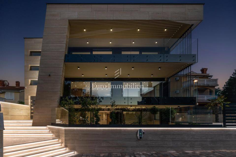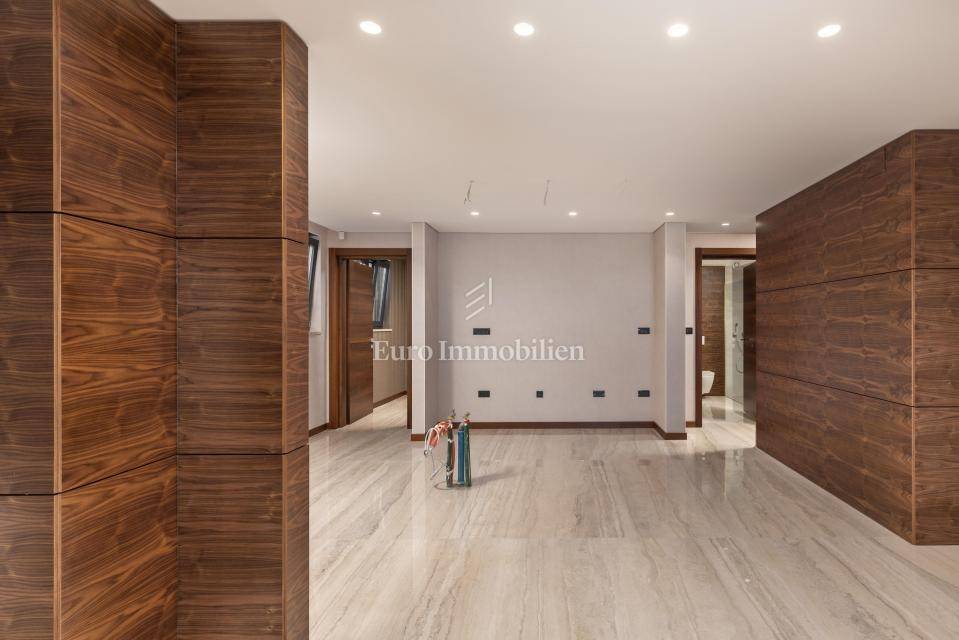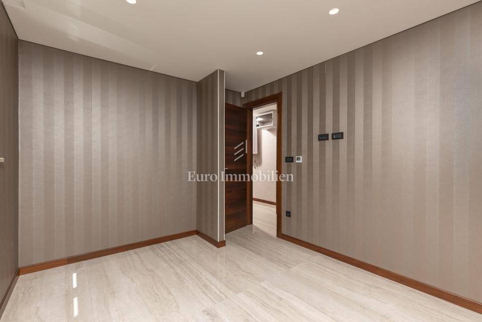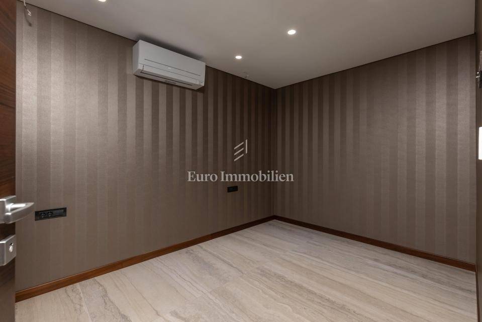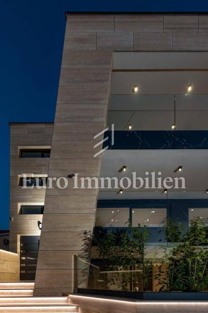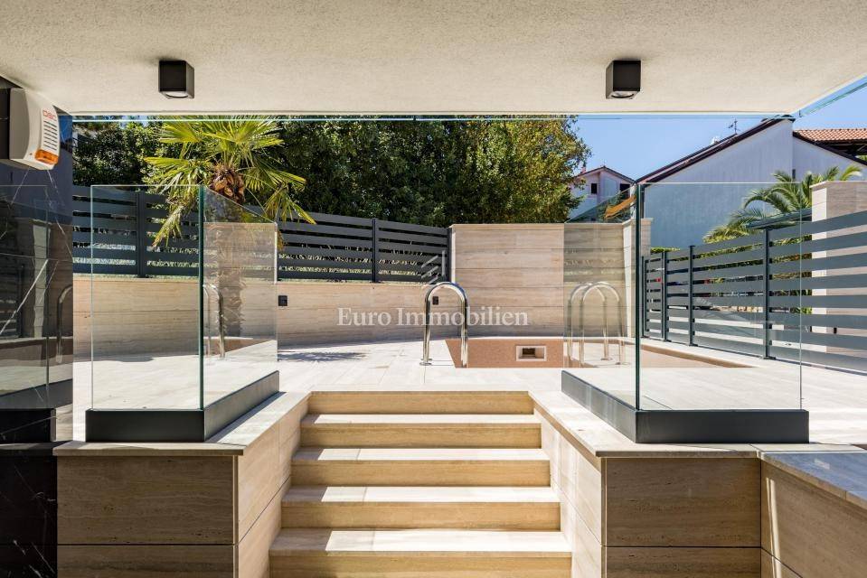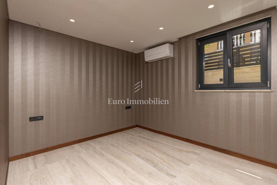The apartment has an area of 113 m2 and consists of a hallway, living room, kitchen and dining room, three bedrooms, two bathrooms, a toilet, and a large covered terrace with a view of the sea. It also has a beautifully landscaped garden with a swimming pool and sunbathing area. The highest quality materials and equipment were used in the construction of this apartment villa. Some of the equipment is aluminum carpentry, stone facade, glass fences combined with natural stone, luxury parquet combined with beautiful wallpaper and carefully selected lighting fixtures, as well as top-quality bathroom furniture and sanitary ware. Attention was paid to every detail in the decoration of this luxury apartment.