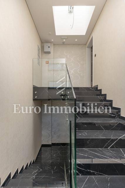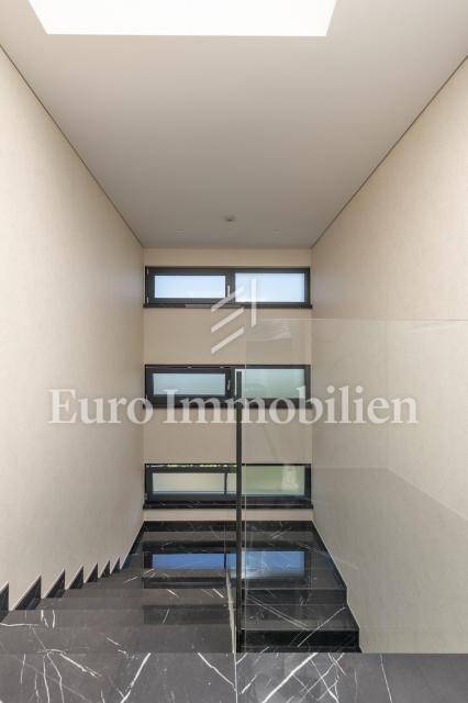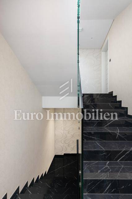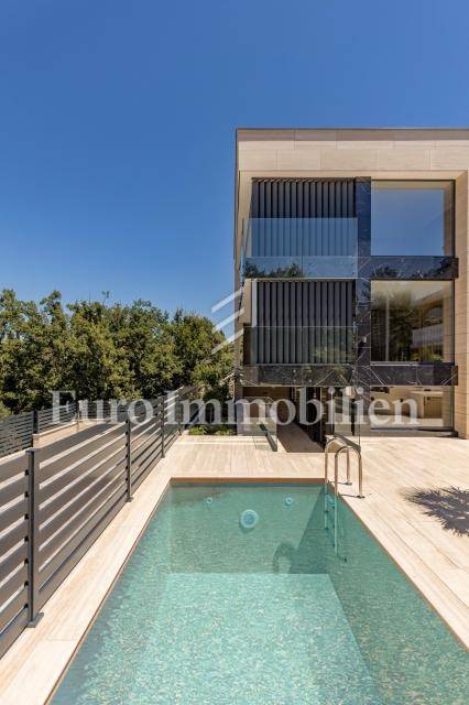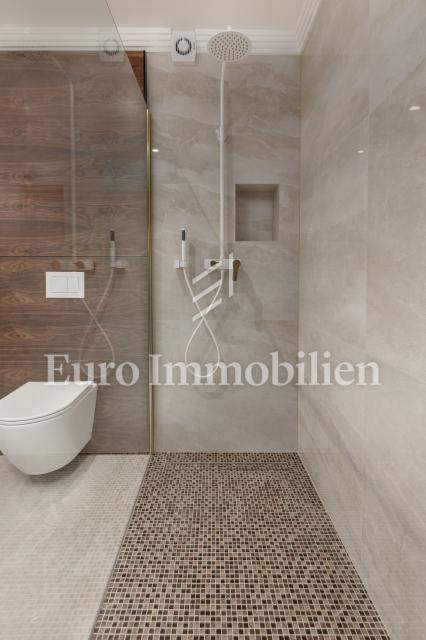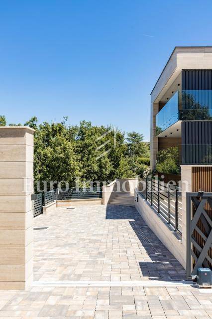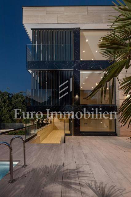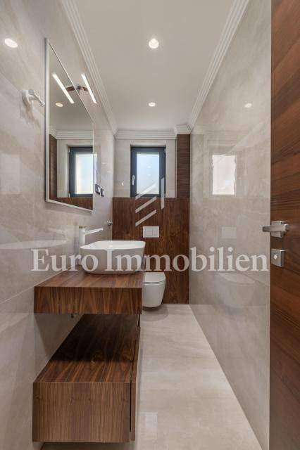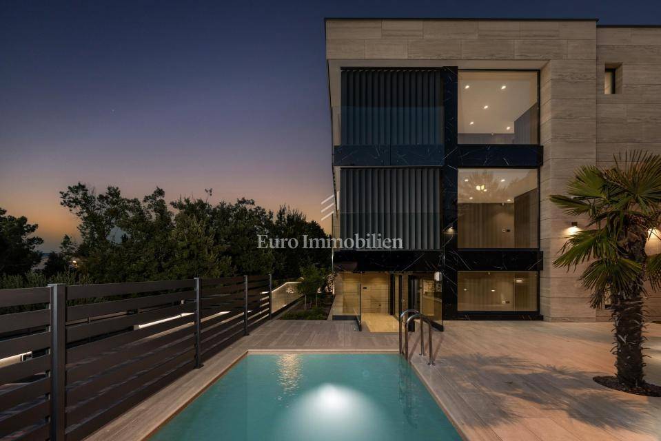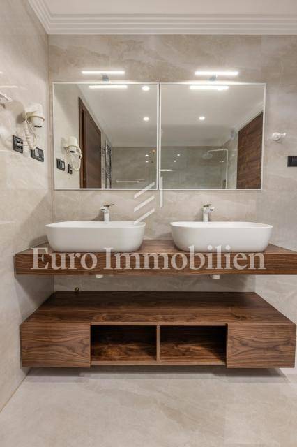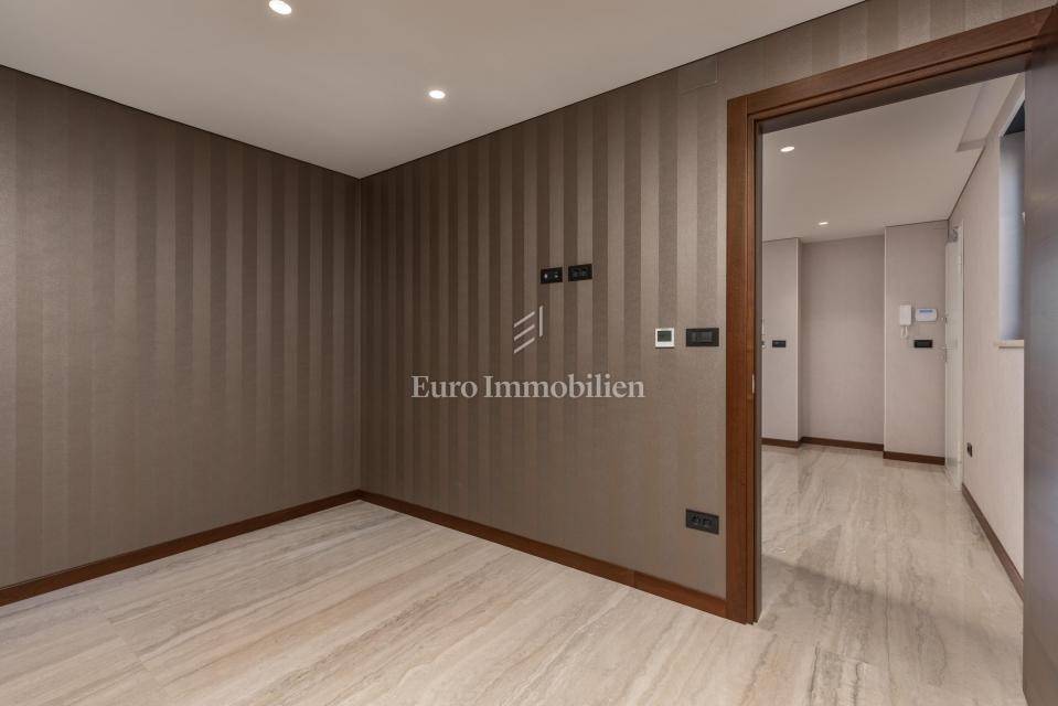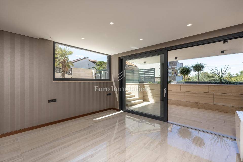 The apartment has an area of 113 m2 and consists of a hallway, living room, kitchen and dining room, three bedrooms, two bathrooms, a toilet, and a large covered terrace with a view of the sea. It also has a beautifully landscaped garden with a swimming pool and sunbathing area. The highest quality materials and equipment were used in the construction of this apartment villa. Some of the equipment is aluminum carpentry, stone facade, glass fences combined with natural stone, luxury parquet combined with beautiful wallpaper and carefully selected lighting fixtures, as well as top-quality bathroom furniture and sanitary ware. Attention was paid to every detail in the decoration of this luxury apartment.