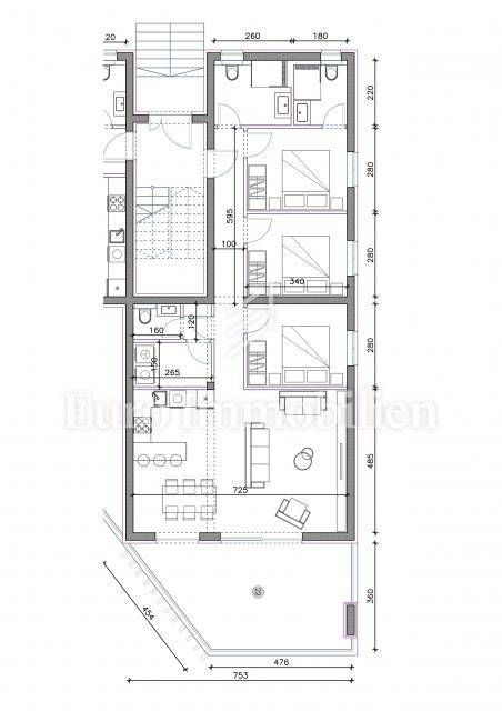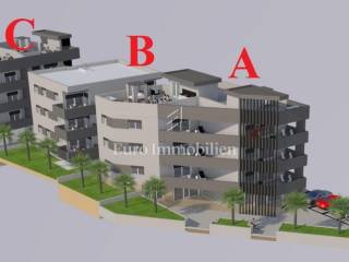 All 3 buildings were built using a quality construction system and consist of an earthquake-resistant reinforced concrete structure. Internal walls and ceilings are made with finely smooth surfaces with millimeter tolerance. The external walls are well insulated with 10 cm of thermal insulation and contain, in addition to classic plaster, water-repellent finishing plaster in color. All apartments are equipped with high-quality PVC windows and doors with electric ALU blinds and mosquito nets. The external carpentry is installed in accordance with the RAL system and insulated, and gas-filled ISO glass is installed. The electrical installations are made according to the highest standard and contain a modern series of switches and sockets manufactured by TEM Modul. Internal and external lighting is solved with LED technology. Heating and cooling is solved with the help of quality air conditioning devices separately in each apartment. Hot water is heated using its own water heater in each apartment. Sanitary ware and sanitary equipment are from renowned European manufacturers. The apartments are not equipped with furniture except sanitary ware and sanitary equipment in the bathrooms. High quality porcelain ceramic tiles are installed in the bathrooms. The floors in each apartment are equipped with high-quality porcelain ceramic tiles, and the floors in the rooms are equipped with a water-repellent material similar to wood imitation laminate. Penthouse apartments in building A and C are additionally equipped with underfloor heating in the entire apartment, via a heat pump. Hot water is heated using solar systems on the roof and an electric boiler. Construction will begin in January 2024, while completion is scheduled for January 2025.