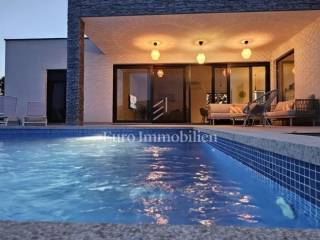 It has an area of 138.50 m2 + 19 m2 covered terrace. The space inside the house is organized into a spacious open space living room with kitchen and dining room, it has three comfortable bedrooms, each with its own bathroom, guest toilet and storage. Large glass walls allow a lot of natural light, and connect the interior and exterior space and lead to a spacious terrace. The house is for sale unfurnished, with an equipped kitchen and bathrooms, with built-in air conditioners, underfloor heating in the living room and bathrooms. There is a heated swimming pool with a sunbathing area and a parking lot in the beautifully landscaped garden.
