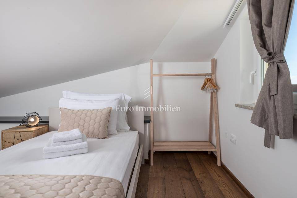Ground floor - one-bedroom apartment with a living room separated from the second part of the ground floor, which has a summer kitchen with a dining room that leads to a terrace with a swimming pool and a lounge area. The entire ground floor is oriented to the south.