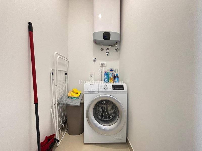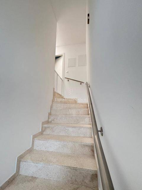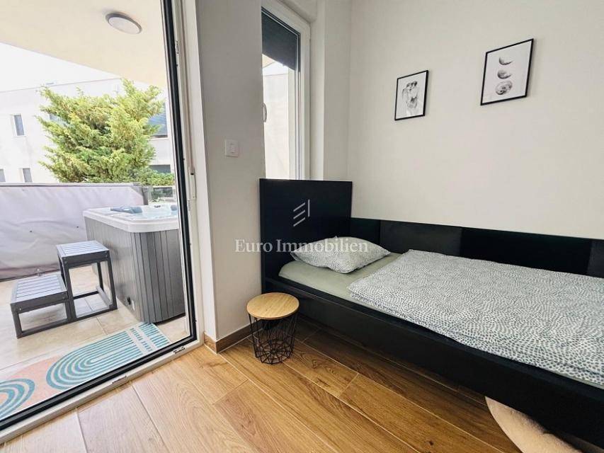 For sale: a modern duplex apartment of 59.56 m² on the ground floor and 1st floor, designed like a townhouse. The ground floor features a private entrance, living room with kitchen and dining area, WC, storage, and utility space, while the first floor includes 2 bedrooms, a bathroom, and a landing. A highlight is the covered terrace of 8.86 m² with a jacuzzi and a covered balcony of 7.34 m².