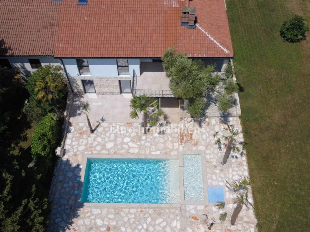 In front of the house there is a 10 x 4 m swimming pool with a sunbathing area surrounded by palm trees and century-old olive trees. The house features five bathrooms, three fireplaces, air conditioning units, and a video surveillance system. The yard is equipped with infrastructure for an electric vehicle charging station.