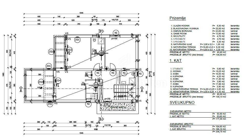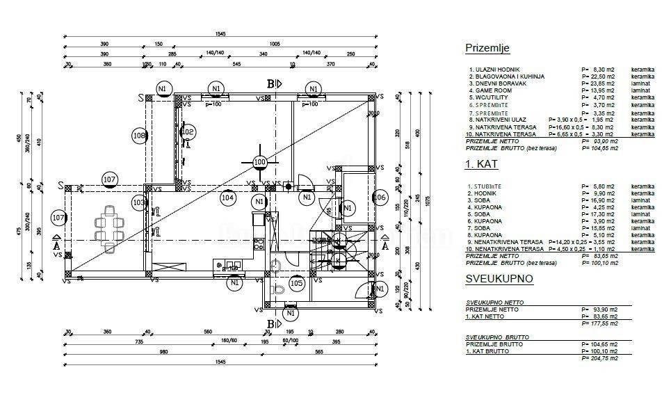 The ground floor has an entrance hall, kitchen, dining room, living room, toilet, two storage rooms, a playroom and two covered terraces.